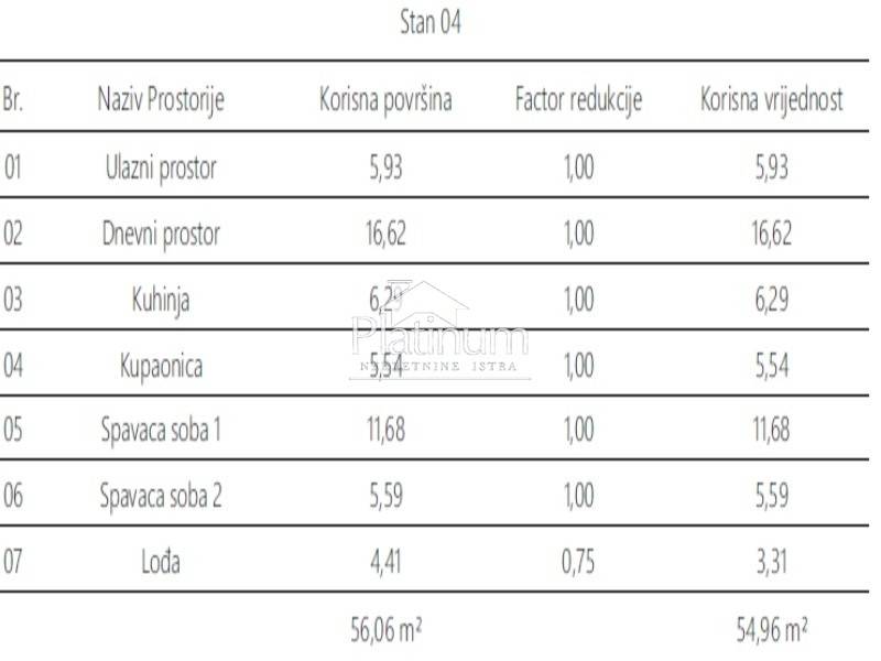 The offer includes apartments under construction in a modern multi-apartment building with four floors. The ground floor of the building will house business premises, while the upper floors will house one- and two-bedroom apartments. The building will have an elevator. You can choose between outdoor parking spaces or garage spaces within the building. The apartment on the first floor, with a total area of 54.96 m, consists of a hallway, two bedrooms, a living room with a kitchen and a dining room, a bathroom and a loggia. The planned completion of construction is October 2027. For any additional information, please contact us at +385976668173.