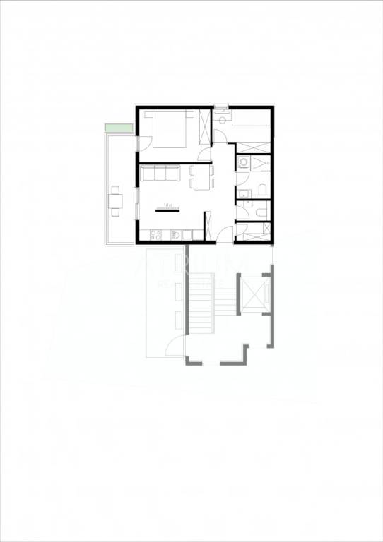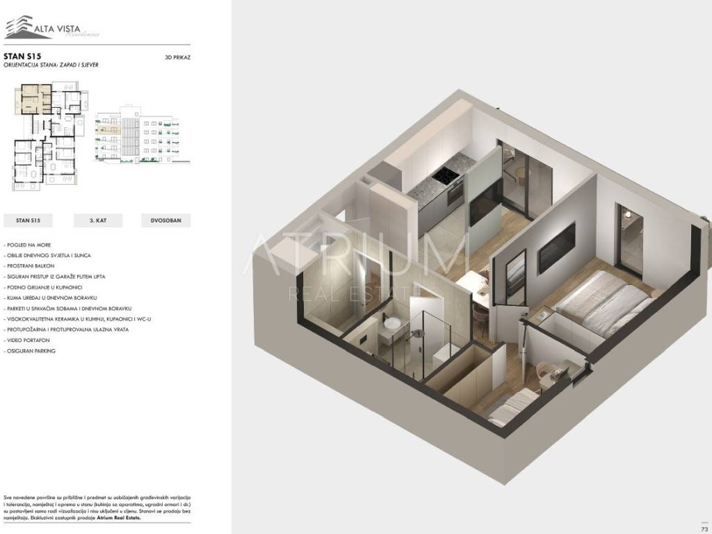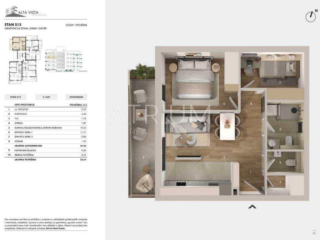 For sale is a modern two-bedroom apartment S15, located on the third floor, with stunning panoramic views of the Adriatic Sea and the surrounding Dalmatian islands. The apartment is west-facing, while the smaller bedroom faces north, allowing for plenty of natural light and beautiful evening sunsets. The total area is 58.64 m², with a functional and comfortable layout: entrance hall 2.49 m², bathroom 4.26 m², WC 1.78 m², storage 1.87 m², kitchen with dining area and living room 19.25 m², bedrooms 11.31 m² and 6.88 m², and hallway 1.35 m². A covered balcony of 9 m² and private green area of 0.45 m² provide a perfect outdoor space for relaxation.