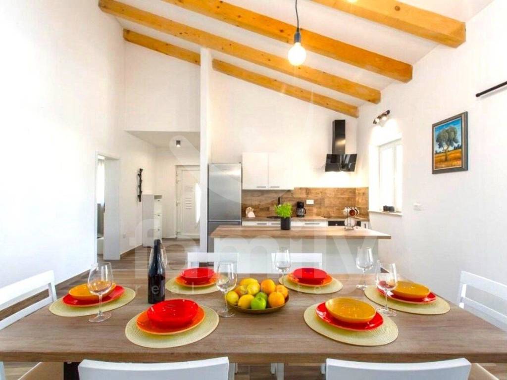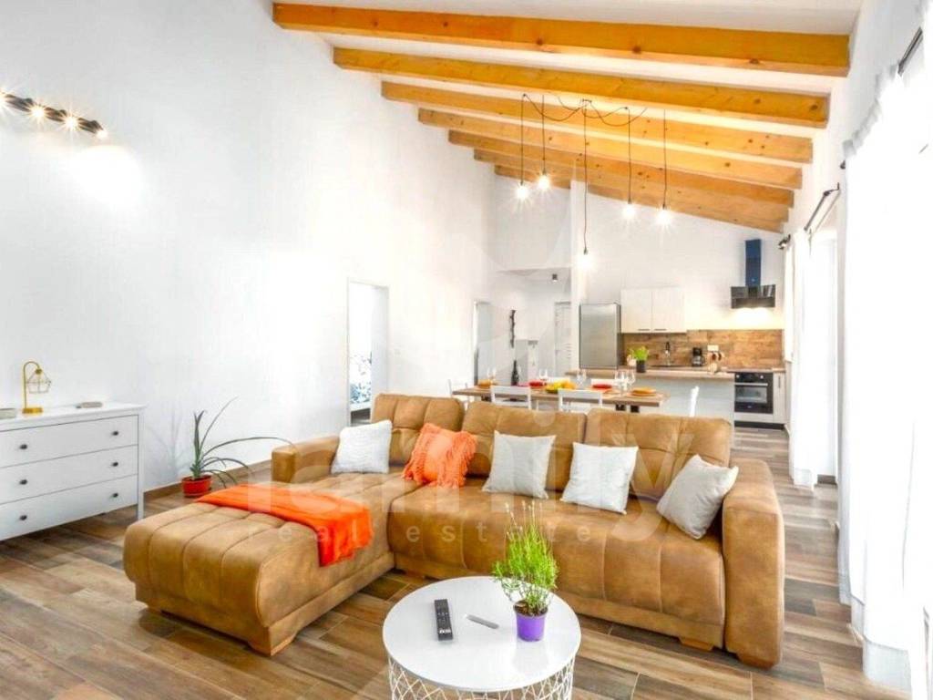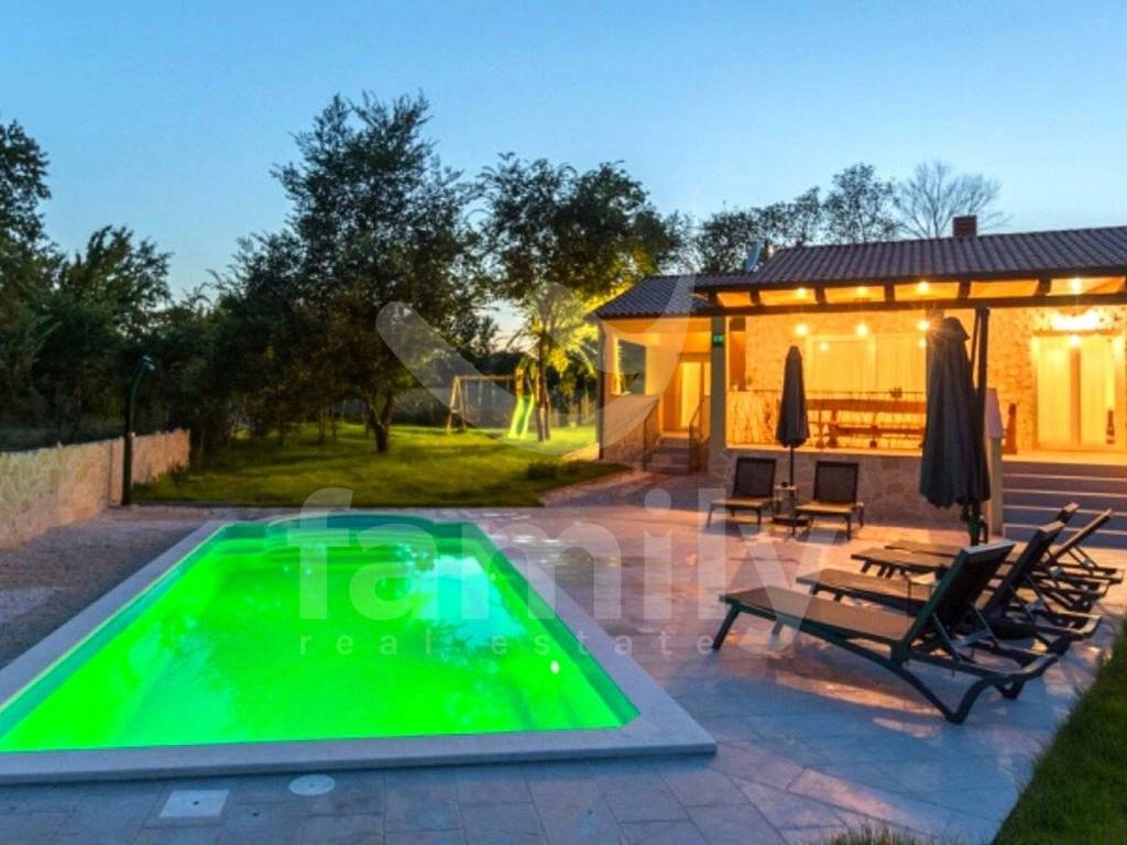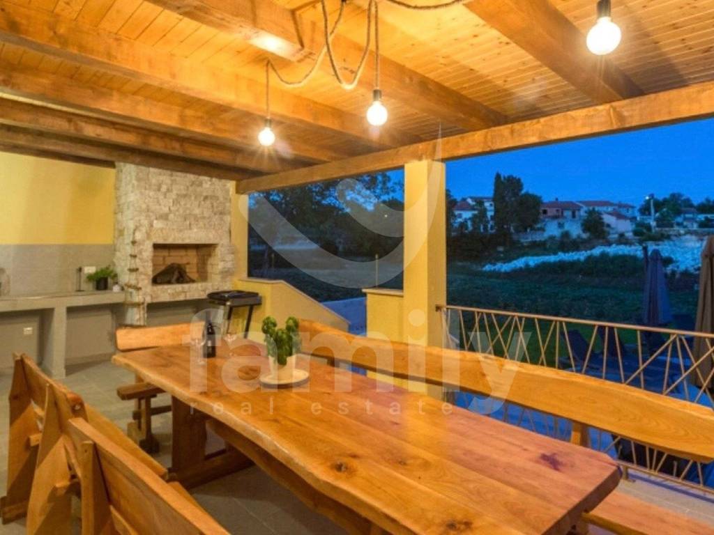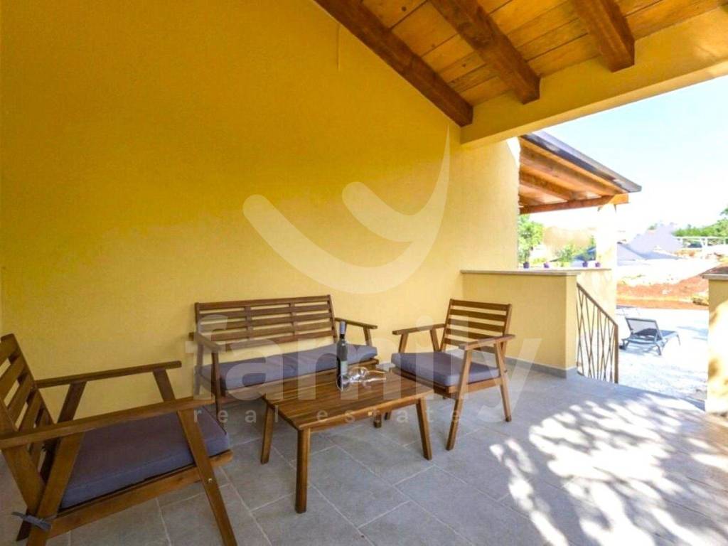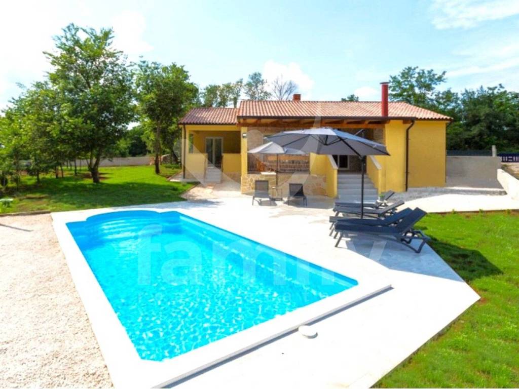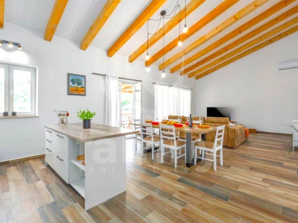 In the immediate vicinity of the municipality of Žminj, as part of a smaller settlement, there is this beautiful detached house on a large plot. The total area of the garden is 928 m2, while the area of the house is 180 m2. The spacious sunny living room is open plan together with the dining area and the kitchen. The house also has three bedrooms and three bathrooms, a storage room, three covered terraces, a swimming pool. The heating and cooling system is regulated by four air conditioning units, and the house has underfloor heating, there is a possibility of heating with wood. During the construction of the property, attention was paid to the use of the type of material, and the thermal insulation is 10 cm, and the roof insulation is 20 cm. PVC joinery is two-layered with 7 gas chambers - salamander. The property is sold with all furniture and household appliances.