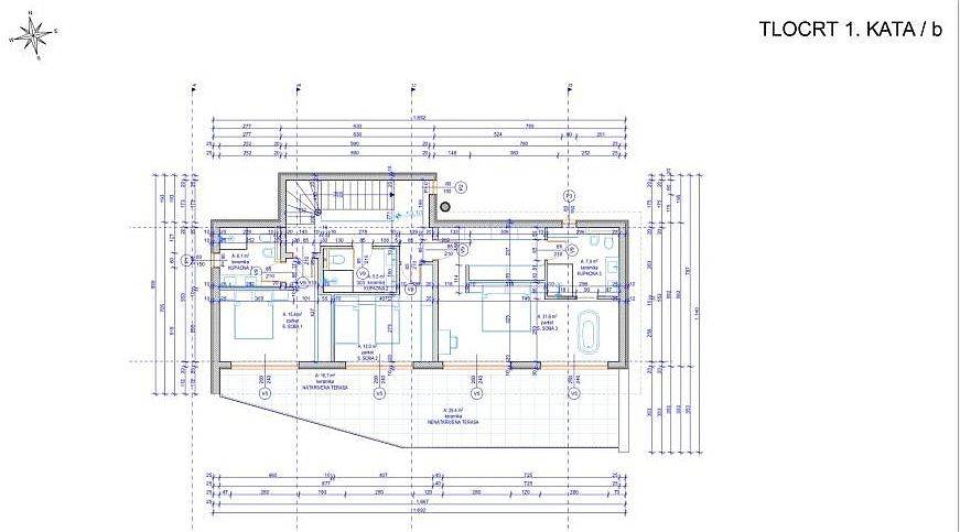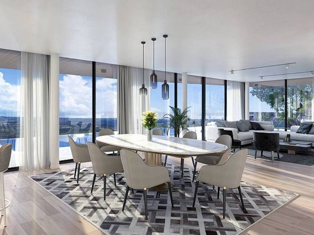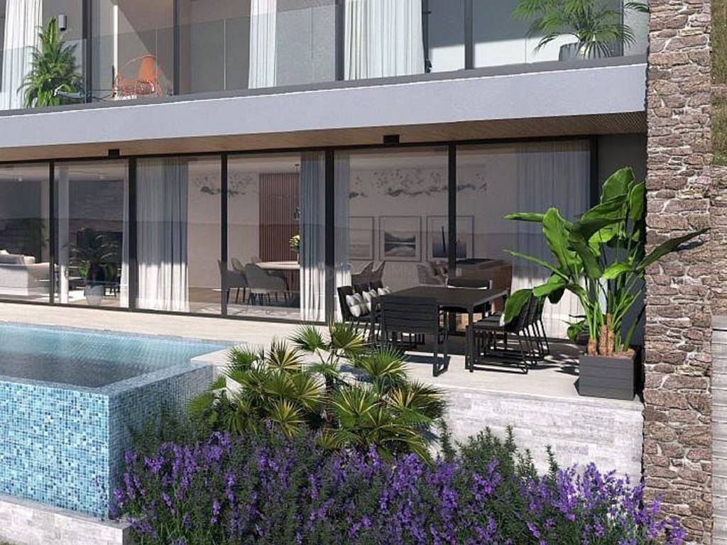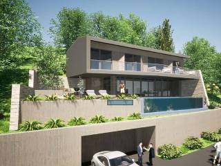 The villa extends over three floors with a total net area of 430 m2, including approximately 280 m2 of living space and 149 m2 of spacious terraces. The basement features a garage for two vehicles, technical rooms and additional space suitable for a gym, sauna or wine cellar. The ground floor consists of an open-plan living area with kitchen and dining room, guest toilet and direct access to the terrace and a private 35 m2 swimming pool with sunbathing area and sea view. The upper floor offers three spacious bedrooms, each with its own bathroom and access to a terrace.