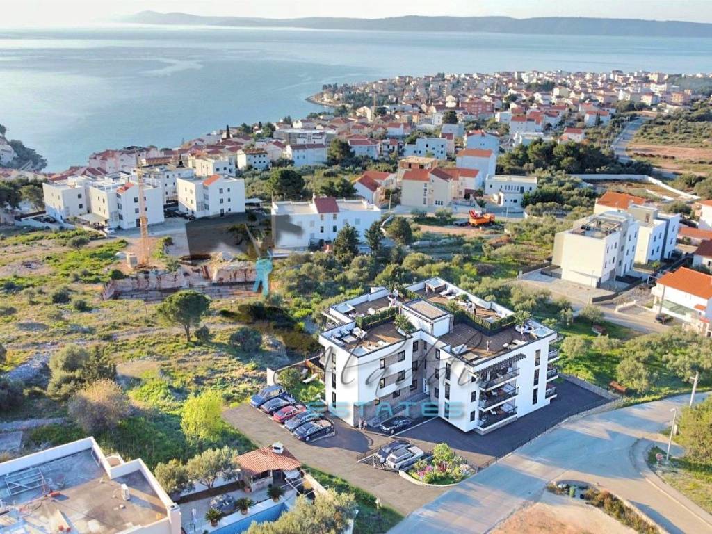 The building is located in a very attractive location, slightly elevated with sea views from all floors. The sea and beach, shops, restaurants and cafes, school and kindergarten, pharmacy, medical, dental and physiotherapy offices, as well as other additional amenities are all nearby, including the town of Trogir with its UNESCO-protected historic core and Split airport. Opposite the building is a public parking lot with plenty of free parking spaces.
