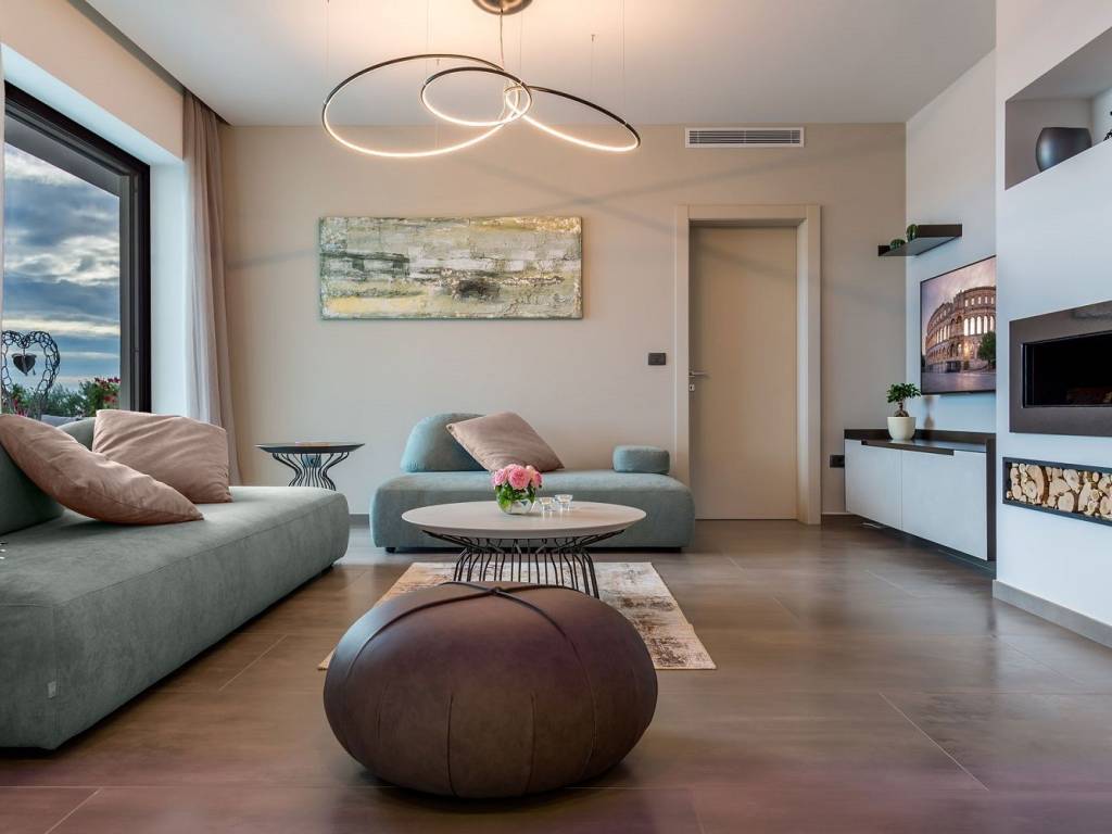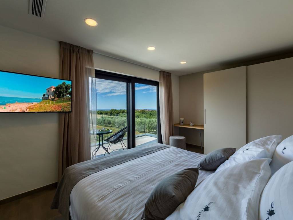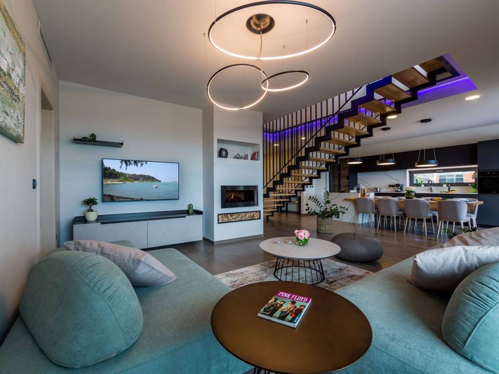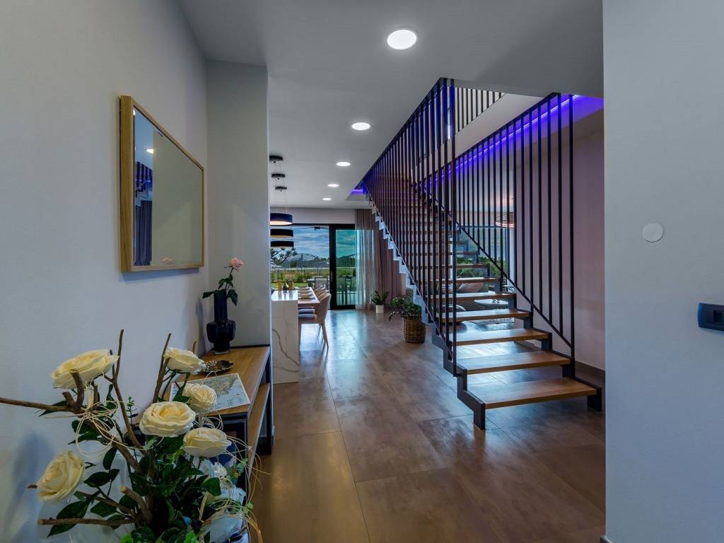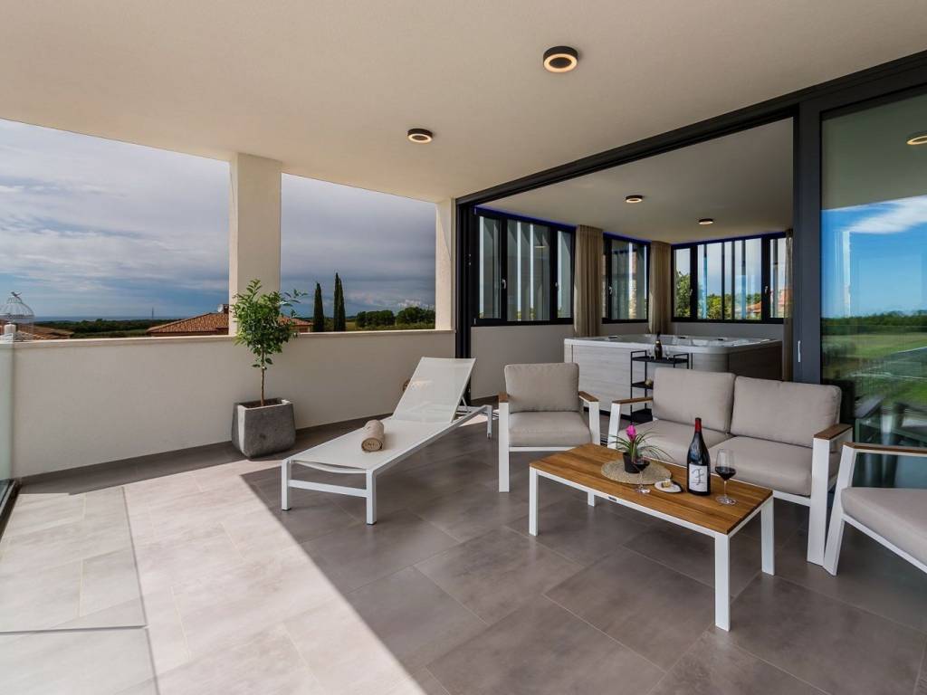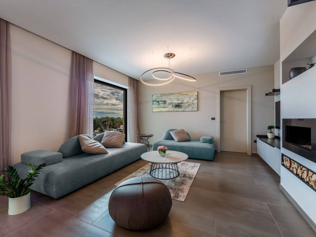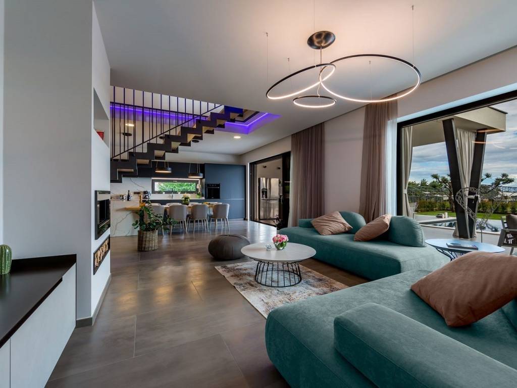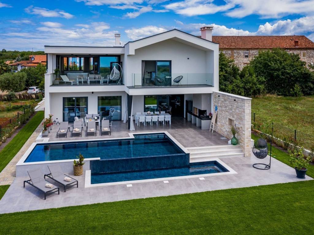 An exclusive modern villa for sale near Poreč, the sea and beaches.This special villa on a fenced plot of 600 m2 offers an infinity pool with salt water of 39 m2, a children's pool of 15 m2, a spacious covered terrace with a large dining table and an equipped summer kitchen with a gas grill, a wood grill and a large "American" refrigerator and 3 parking spaces. The villa has an area of 295 m2 on two fully air-conditioned floors. On the ground floor there is an attractive living room with an equipped kitchen, dining room and living room, all in one space, one double room with its own bathroom and one children's room with a bathroom. On the first floor there are three double rooms, each with its own bathroom, a wellness area with a large whirlpool and sauna, and a terrace with deckchairs offering a beautiful panoramic view of the sea.In the basement of the villa, there is a pool equipment and a storage room.The villa also has solar panels.