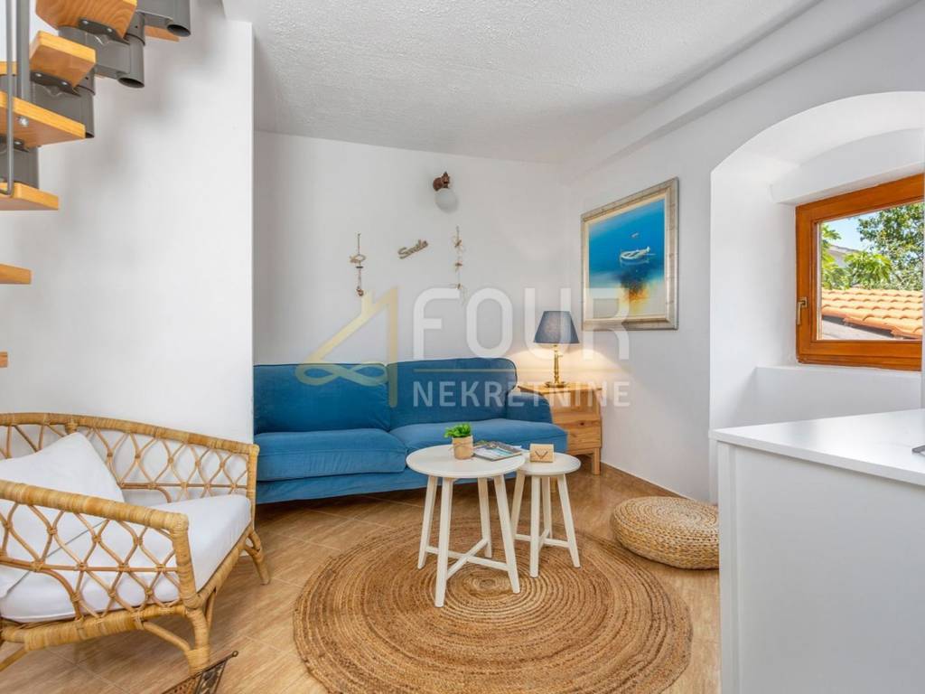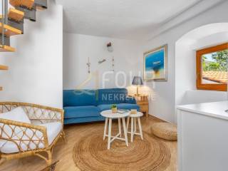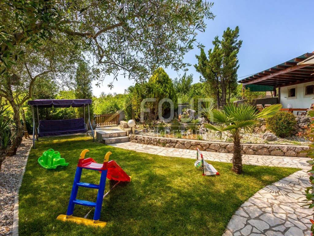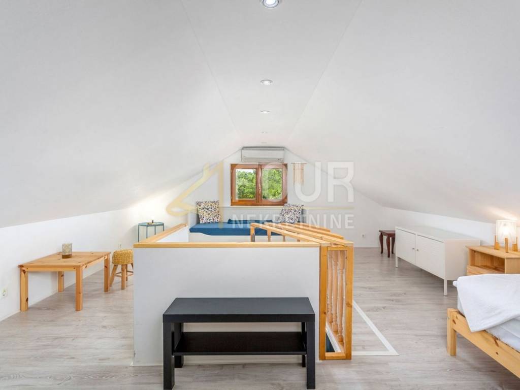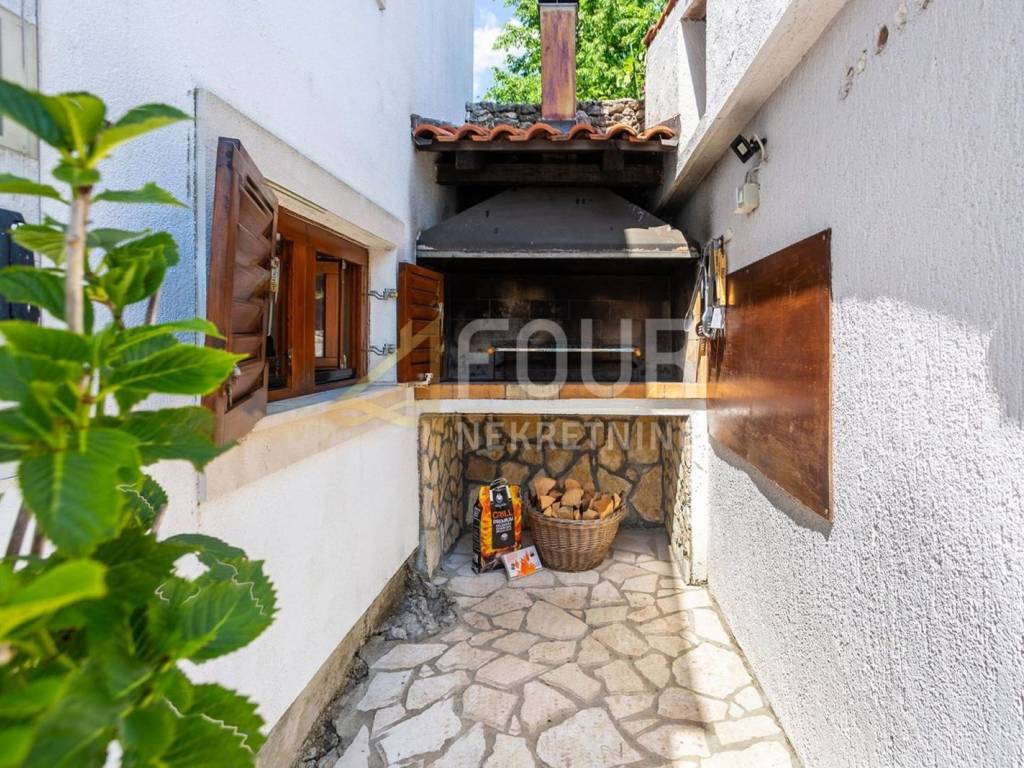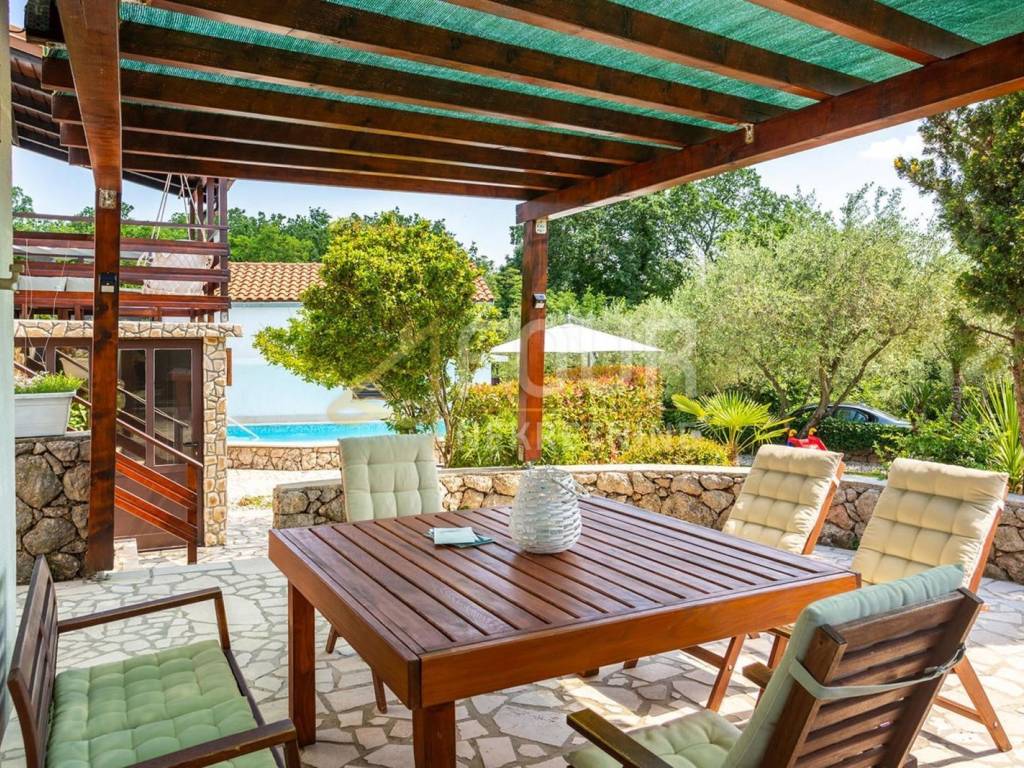 A detached villa with a pool is for sale, located in a quiet area near Vrbnik, surrounded by greenery and privacy, only about 2 km away from the sea. The house has a total living area of ​​approximately 205 m2, built on a plot of 549 m2, with a beautifully landscaped garden of 317 m2. It consists of two completely separate two-storey apartments with separate entrances, making it ideal for joint purchase by two families or as an investment for tourist rental. The first apartment includes a ground floor with a hallway, a bathroom, and a living room connected to the kitchen and dining room, while on the first floor there are two bedrooms. The second apartment is spread over the first floor and attic and includes a living room with a kitchen, a bathroom, and a bedroom, with a spacious room with multiple beds in the attic. The house was renovated in 2014, equipped with a fireplace, air conditioning units, and high-quality wooden joinery. The heating system includes a wood stove, electric radiators, and heaters, allowing for a comfortable stay throughout the year. The property includes a furnished cellar for socializing, woodshed, several storage rooms, a garage, and a total of four outdoor parking spaces. The garden offers numerous amenities for relaxation and enjoyment, including a heated pool of 29 m2, a sun deck, an outdoor barbecue, a garden, and a garden house, as well as a large terrace of 16 m2. It is being sold fully furnished and equipped. The property represents an ideal combination of a quiet location, functional layout, and a safe investment on the island of Krk.