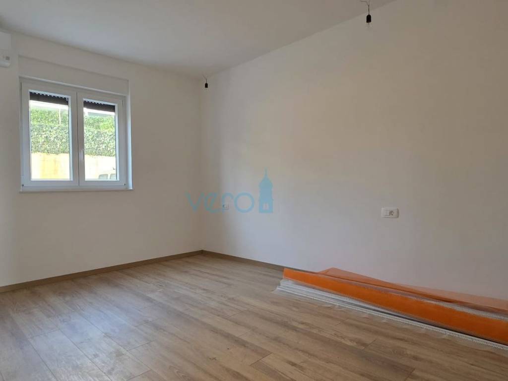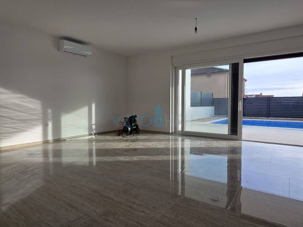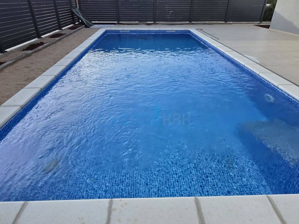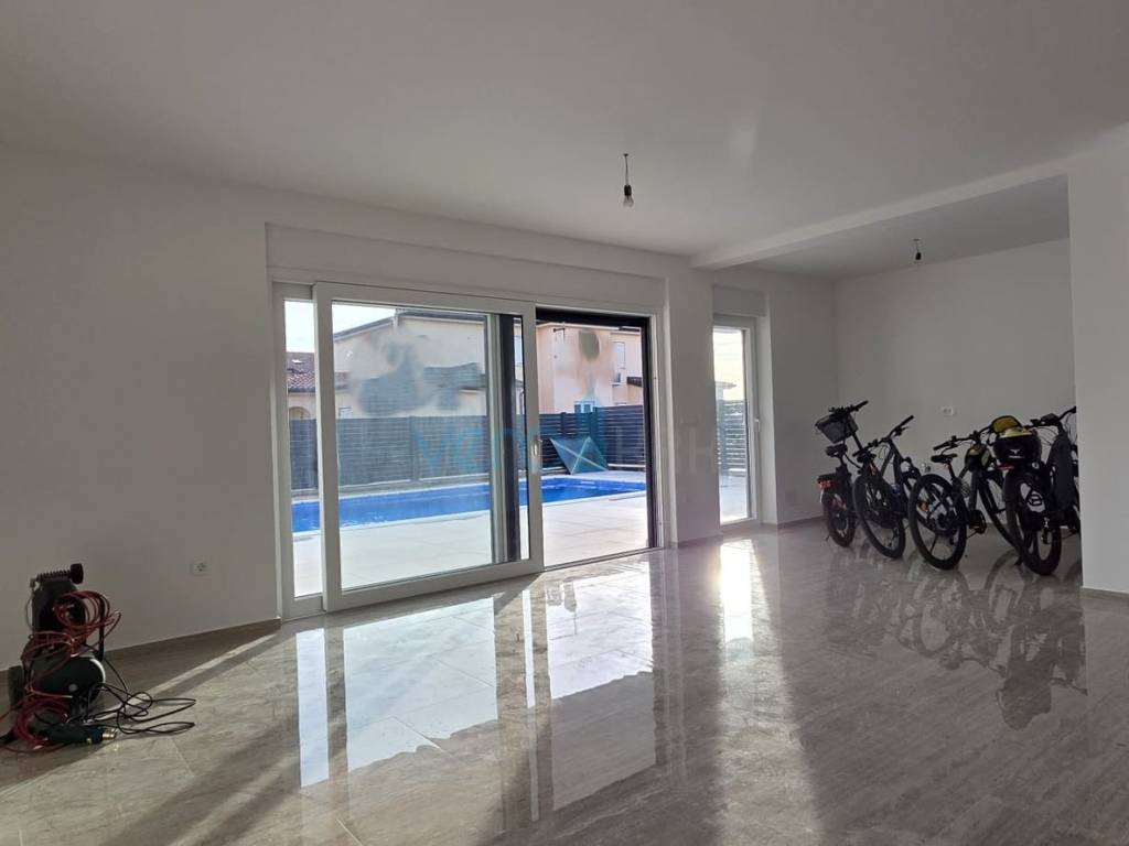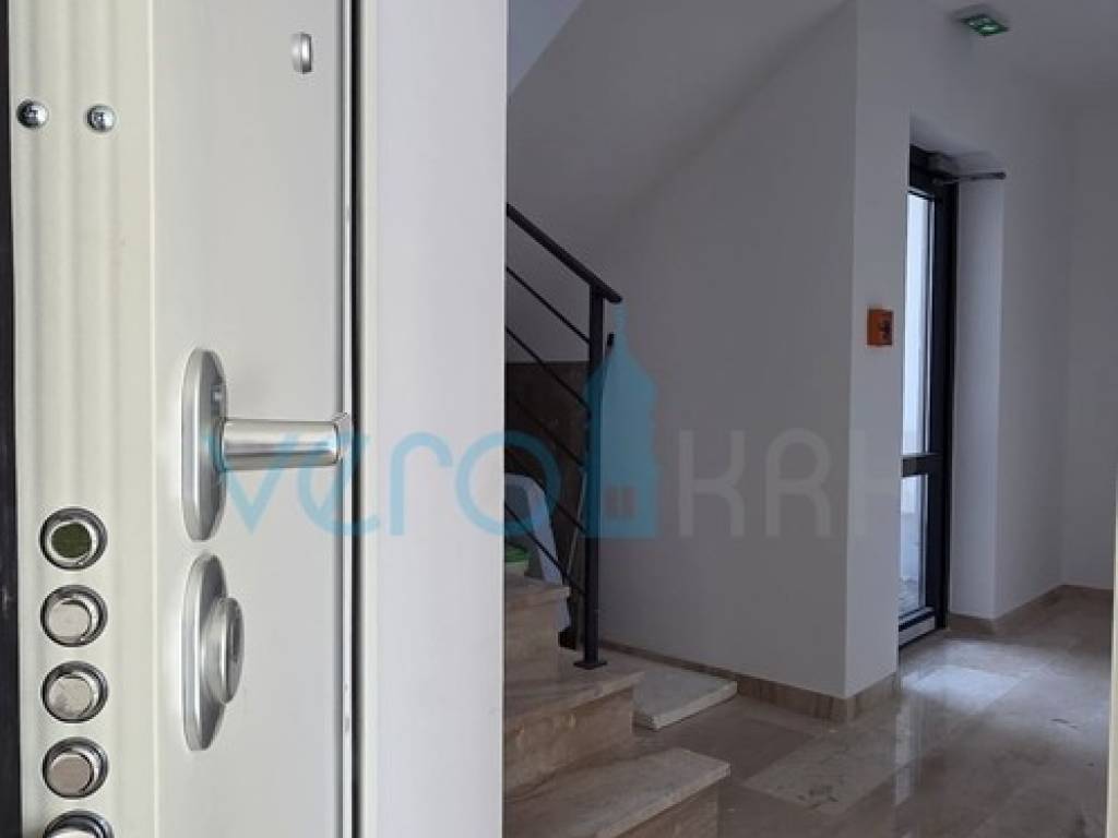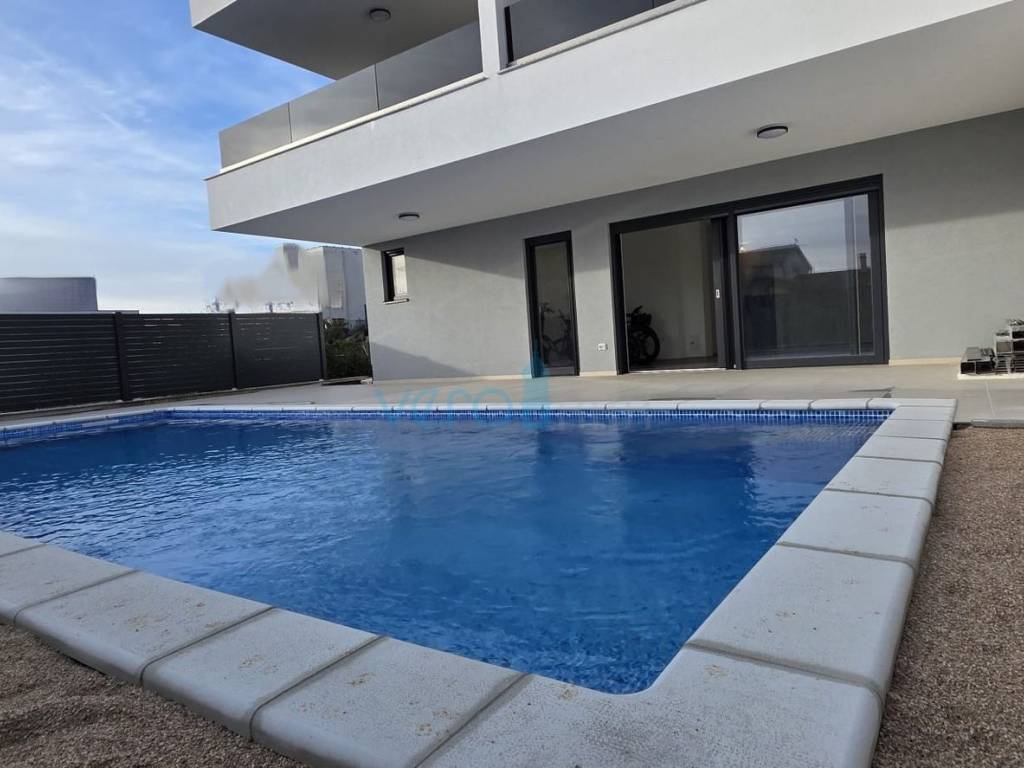 The apartment of 123.63 m2 is located on the ground floor of a residential building with 8 apartments. It consists of an entrance hallway, three bedrooms, two bathrooms, a large open space combining the kitchen, dining room, and living room with access to an outdoor covered terrace of 22 m2. From the ground floor, there is a partial sea view. The apartment includes a beautiful pool with a skimmer system (jets) and premium foil covering an area of 27 m2, two parking spaces, and a yard.