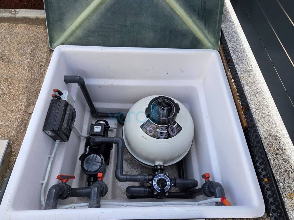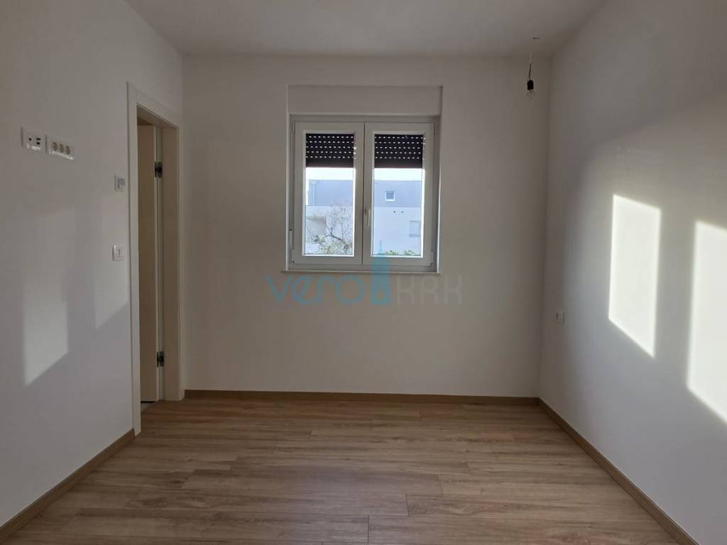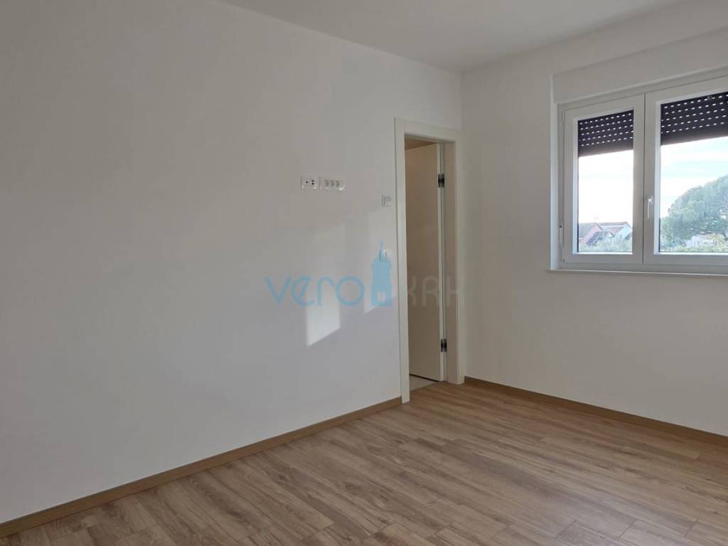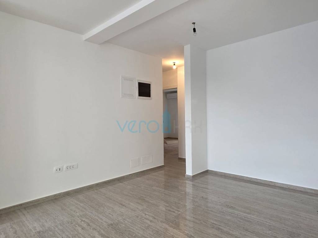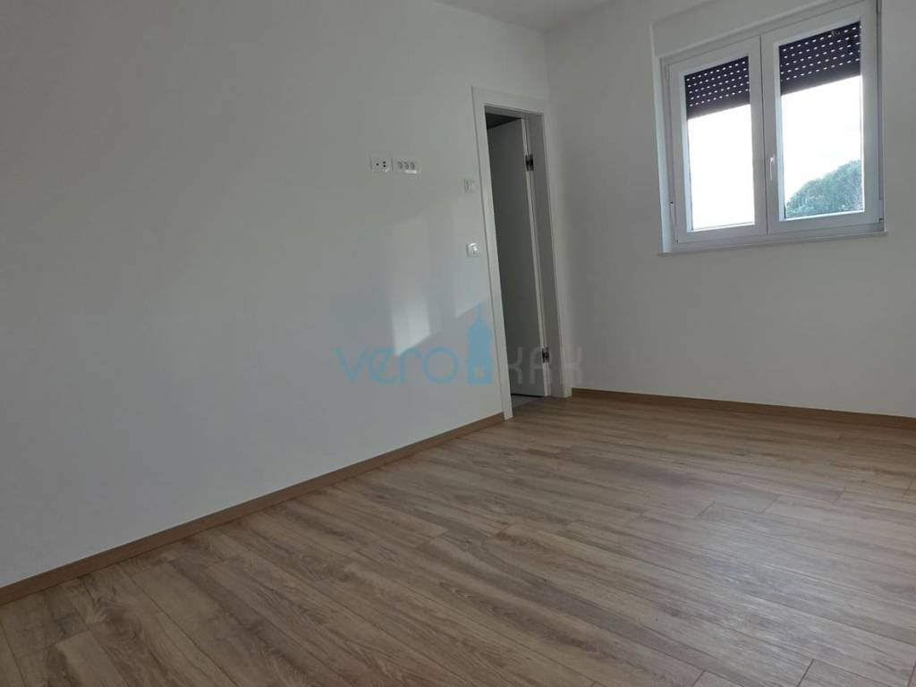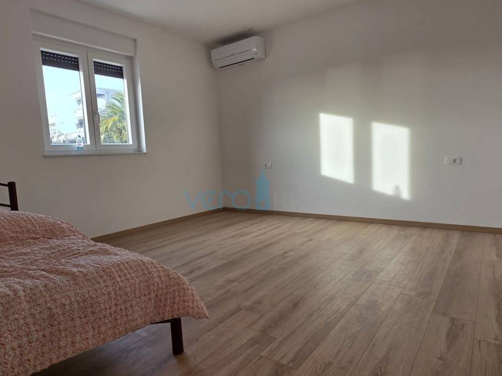 The apartment of 123.63 m2 is located on the ground floor of a residential building with 8 apartments. It consists of an entrance hallway, three bedrooms, two bathrooms, a large open space combining the kitchen, dining room, and living room with access to an outdoor covered terrace of 22 m2. From the ground floor, there is a partial sea view. The apartment includes a beautiful pool with a skimmer system (jets) and premium foil covering an area of 27 m2, two parking spaces, and a yard.