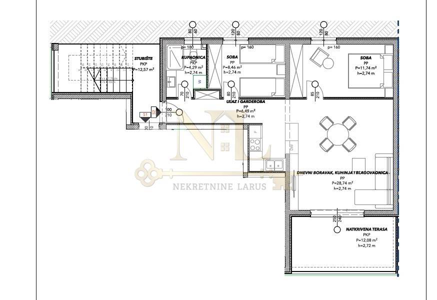We are selling an apartment S2 in a new project in Trogir, Saldun district, on the very border of Trogir and Okrug Gornji, island of Čiovo, south side. Apartment S2 is located on the high ground floor of the building and consists of 2 bedrooms, kitchen and living room, bathroom and covered terrace with sea view. Underfloor heating throughout the apartment, air conditioning in each room. The apartment has one garage parking space and one outdoor parking space. Surfaces: - interior part of the apartment: 59.72 m2 - covered terrace: 12.08 m2 Total floor area of the apartment: 71.8 m2