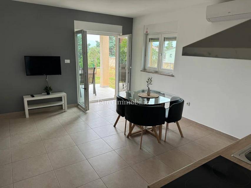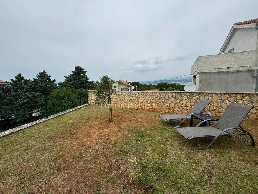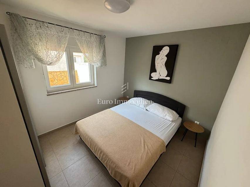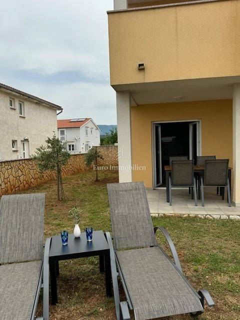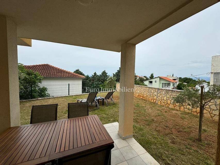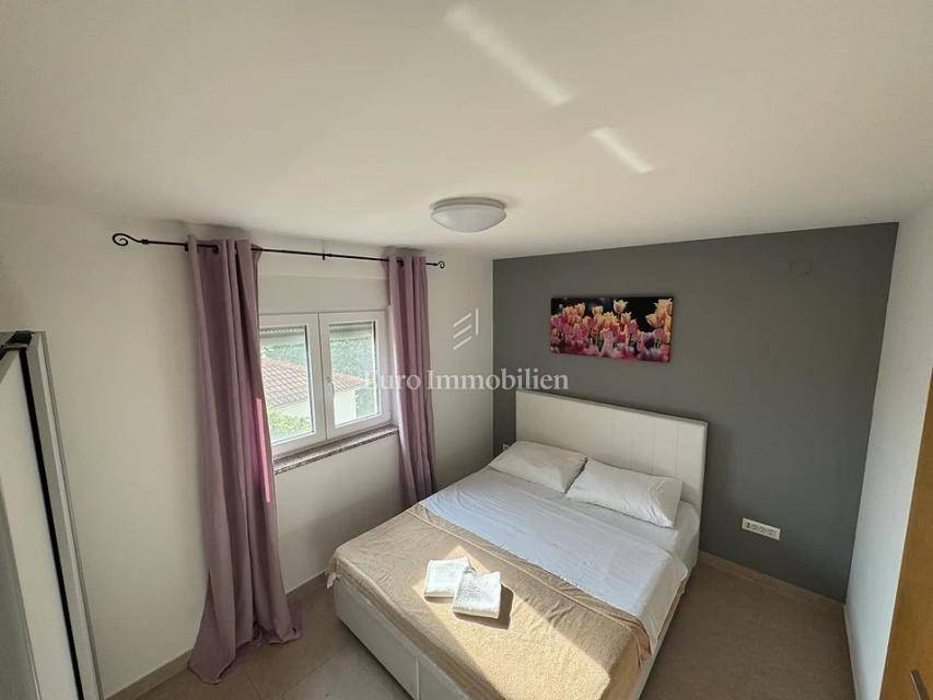 Island of Krk, Omišalj, two apartments with a garden of approximately 150 m2 are for sale. Each apartment consists of a living room with kitchen and dining area, two bedrooms, bathroom and terrace. One apartment is on two floors, and one is only on the ground floor. The apartments are sold with furniture and equipment, completely ready for use. They have a basement of 15 m2 and a parking space. Opportunity for own use or tourist rental.