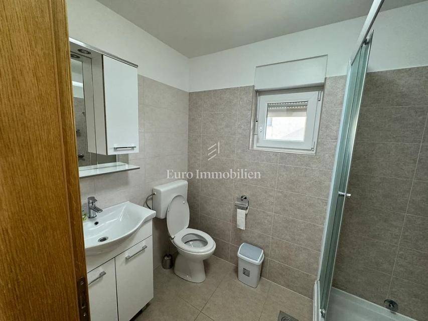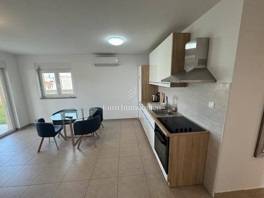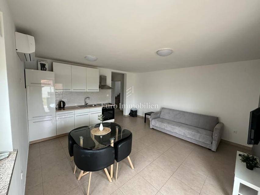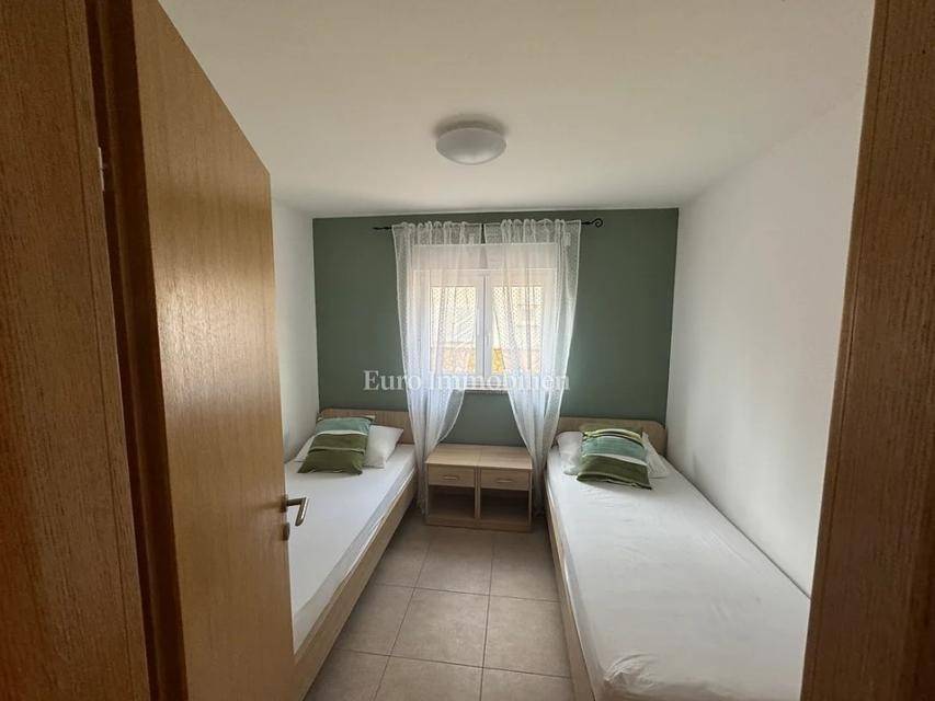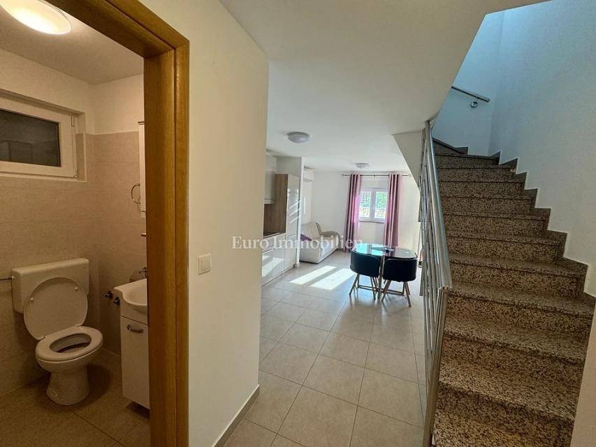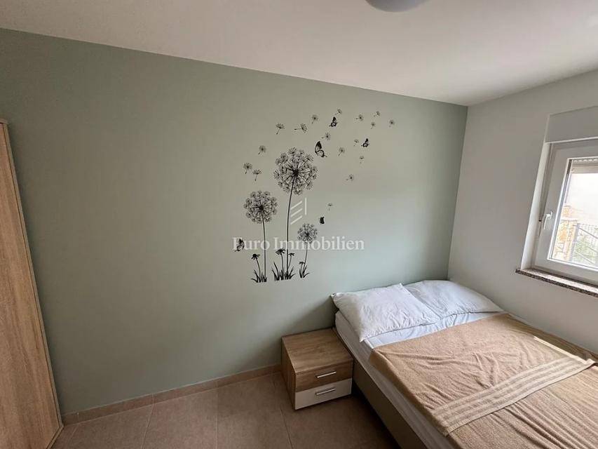 Island of Krk, Omišalj, two apartments with a garden of approximately 150 m2 are for sale. Each apartment consists of a living room with kitchen and dining area, two bedrooms, bathroom and terrace. One apartment is on two floors, and one is only on the ground floor. The apartments are sold with furniture and equipment, completely ready for use. They have a basement of 15 m2 and a parking space. Opportunity for own use or tourist rental.