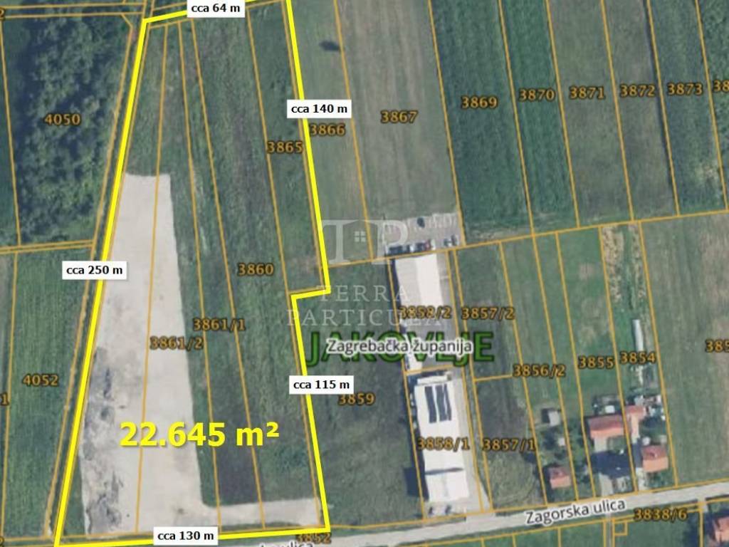 Na prodaju nudimo građevinsko zemljište površine 22.645 m² koje se nalazi u industrijskoj zoni Općine Jakovlje (oznaka "I" gospodarska namjena - proizvodna i poslovna).