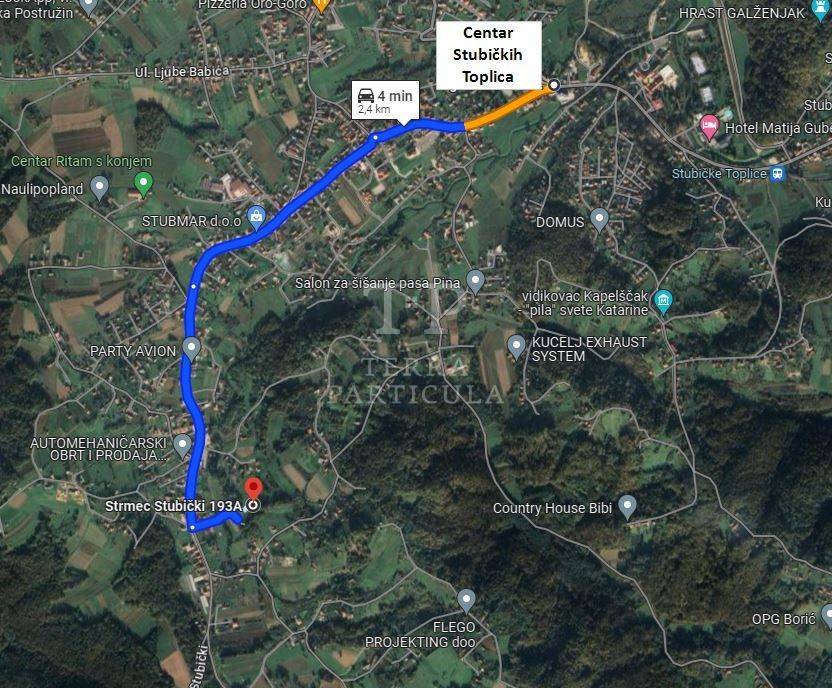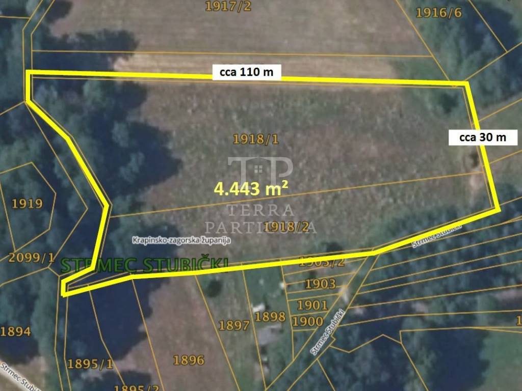 Na prodaju je zemljište površine 4.453 m² od kojeg je cca 3.600 m² u zoni gradnje. Nalazi se iza kuće na adresi Strmec Stubički 165 (cca 100 m odo glavne ceste s desne strane). Sva infrastruktura je uz najbližu kuću. Udaljenost do centra Stubičkih Toplica je 2,4 km.