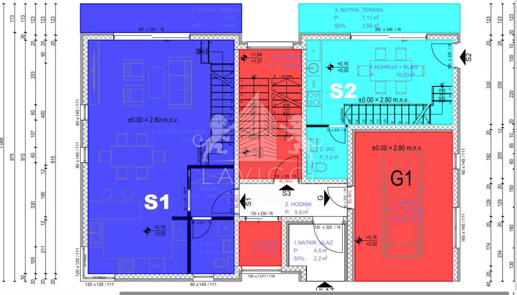 The apartment marked E-1 extends over two floors. The ground floor has an entrance hall, a guest toilet, a living room with a kitchen and a dining room from which, through large sliding glass walls, you can exit to a covered terrace and a garden of 58.32 m2. The total area of the ground floor is 59.01 m2.