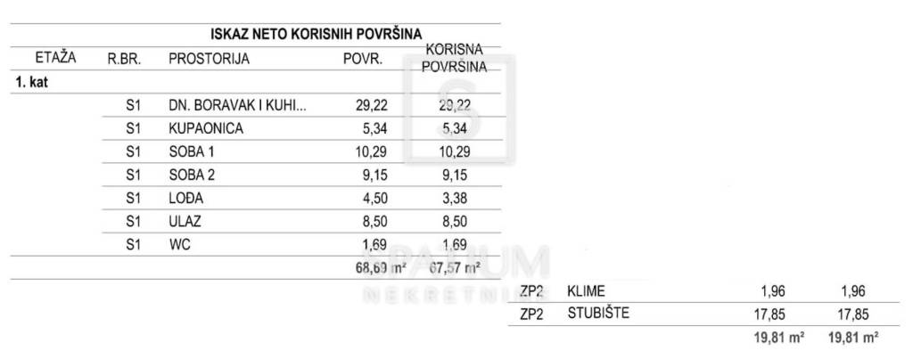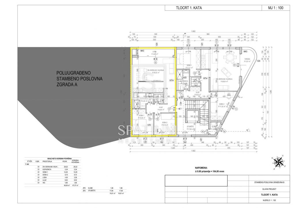The apartment has a total area of 68.69 m², with a calculated net usable area of 67.57 m². It consists of a spacious open-plan living room with kitchen and dining area, two comfortable bedrooms, a bathroom, a separate guest toilet, and an entrance hall. A covered loggia of 4.50 m² adds extra value – perfect for relaxing and enjoying sea views.