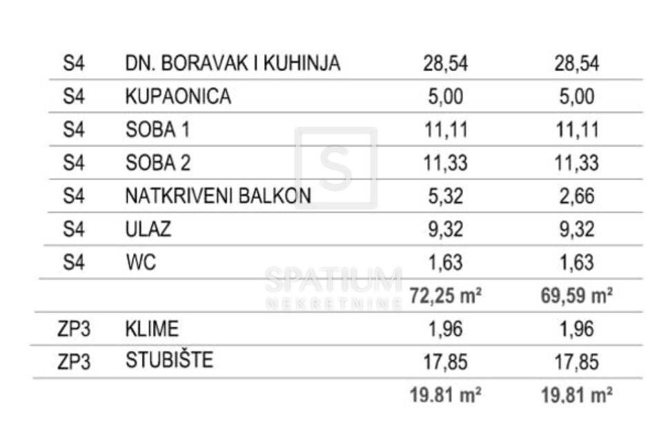 The apartment has a total area of 72.24 m², with a calculated net usable area of 69.59 m². It consists of a spacious open-plan living room with kitchen and dining area, two comfortable bedrooms, a bathroom, a separate guest toilet, and an entrance hall. Instead of a loggia, the apartment features a covered terrace of 5.31 m², perfect for outdoor relaxation with a sea view.