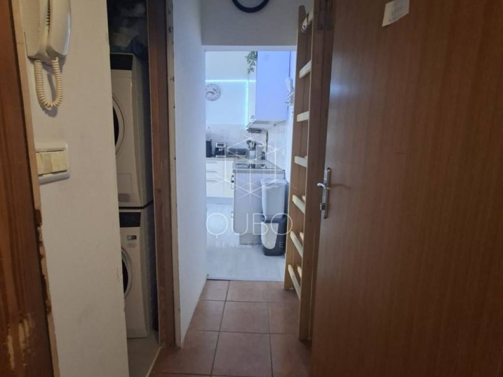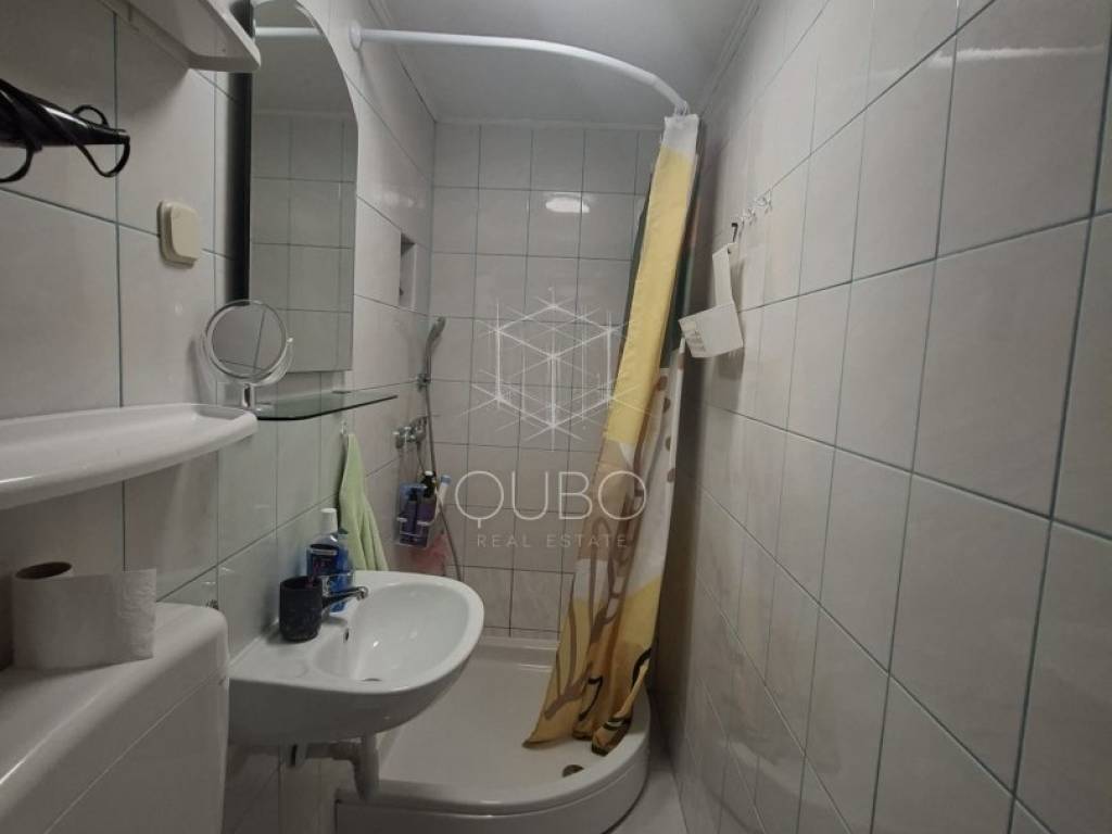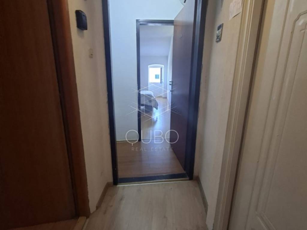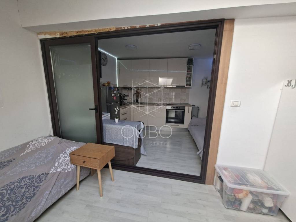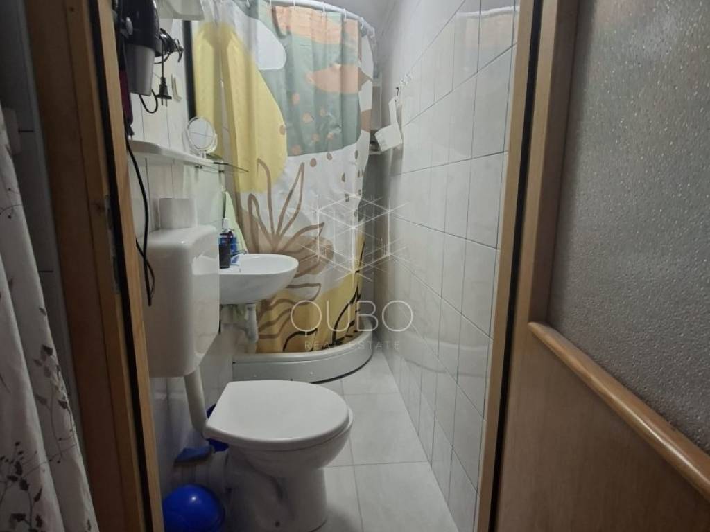 The property occupies the entire floor, and the attic space above the apartment is included in the ownership. It is currently divided into two independent residential units – each with a bedroom, bathroom, and a kitchen with dining area.