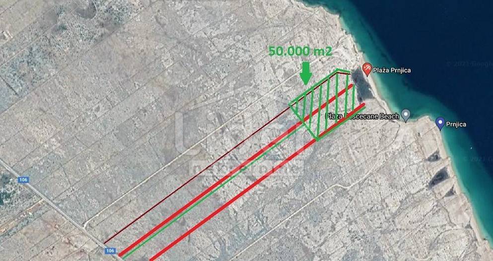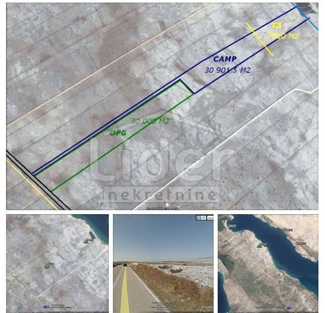 OPCIJE KUPNJE: 1. Kupnja cijele parcele 134.803 m2, Od toga je u zoni T3 cca. 14.000 m2. Parcela se proteže od magistrale Novalja – Pag do plaže i mora. Izvor slatke vode na posjedu. CIJENA: 2.790.000 €
