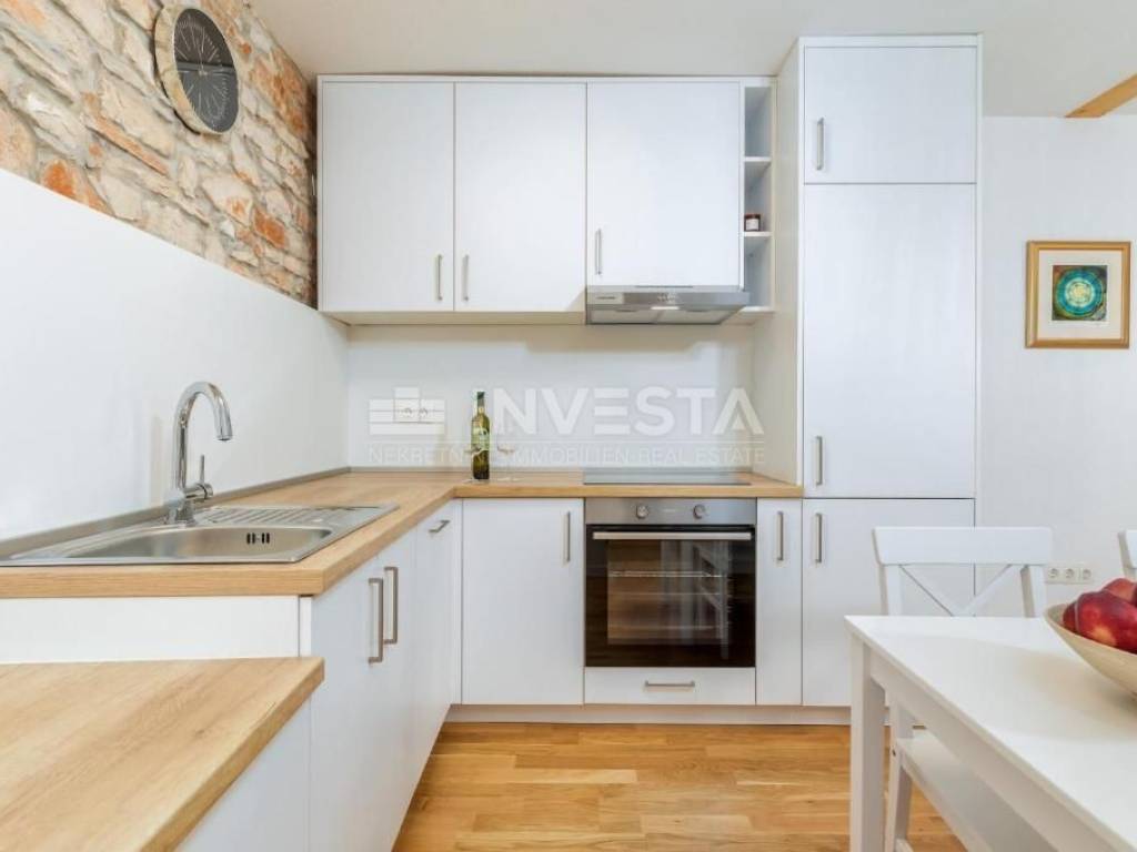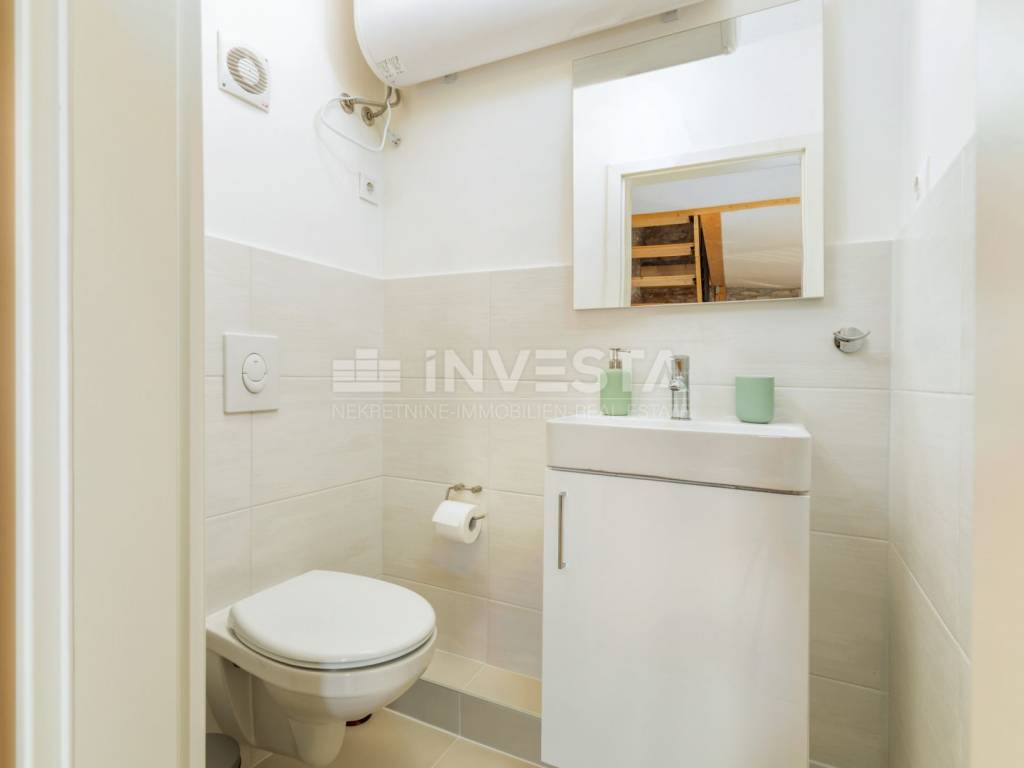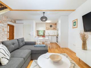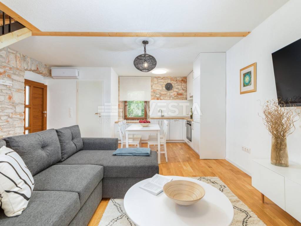 Apartment 2: 60m² in size, spread over two floors; the lower floor contains a bathroom, kitchen + dining area, living room; the upper floor has two bedrooms and a toilet.