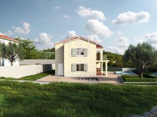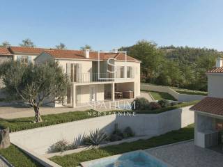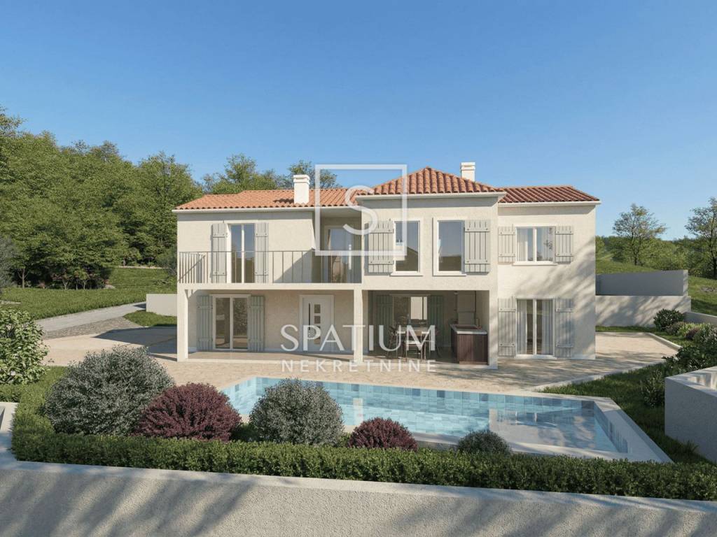 PIĆAN, we are pleased to present a beautiful two-storey house with a total area of 181 m², situated in a peaceful and elevated location offering open views of the surrounding hills and greenery. The ground floor features a kitchen, dining room and living area with a fireplace, a guest toilet, and a covered terrace with a summer kitchen. An internal staircase leads to the upper floor where there are three bedrooms, two bathrooms, and an additional storage room. The house will be finished with ceramic tiles, while laminate flooring is planned for the bedrooms. Heating is possible with wood, pellets, or electricity, and for added comfort, there is an air conditioning unit. In front of the house, the yard includes a swimming pool and a sunbathing area. The property is sold “turnkey”, without furniture or equipment, and comes with a landscaped garden.