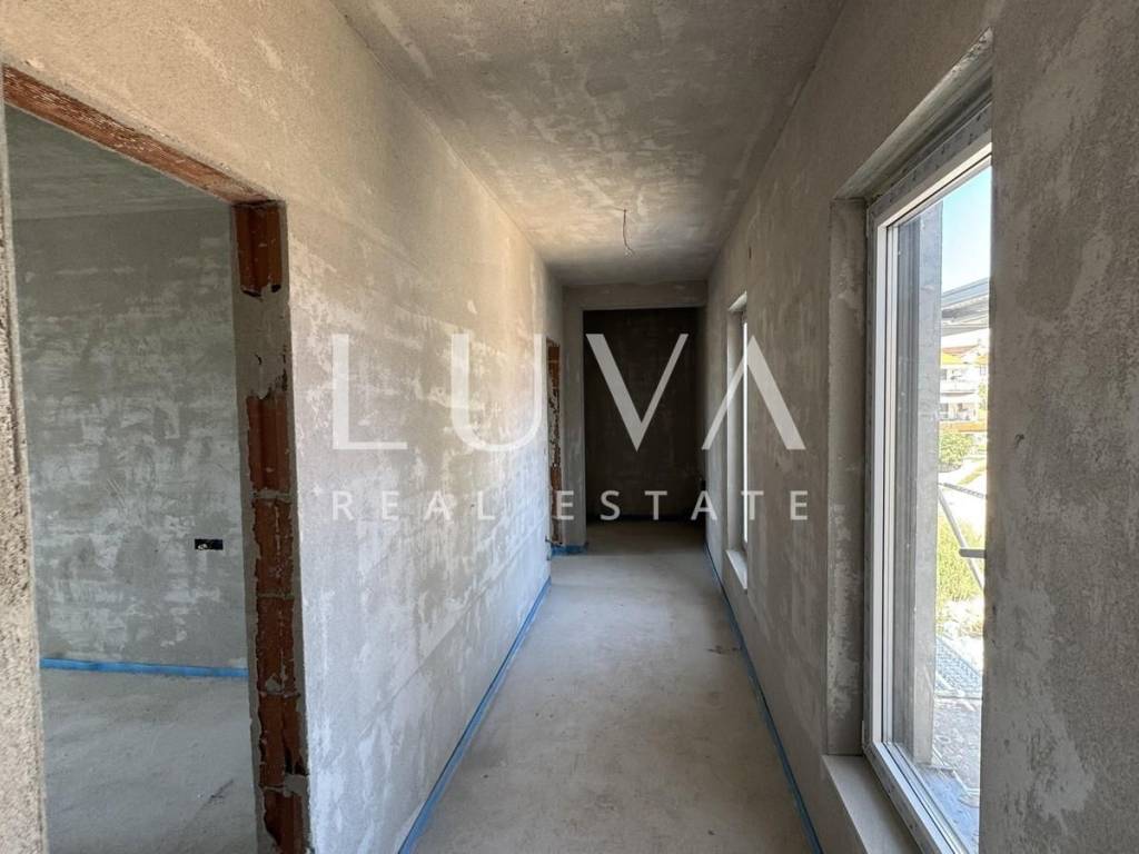 The apartment is located on the second floor and covers 169 m² of net usable area. It consists of a hallway, a spacious living room with an open-plan kitchen and dining room with access to a terrace of 17.47 m², three comfortable and bright bedrooms with modern bathrooms and access to additional terraces. The apartment comes with two parking spaces.