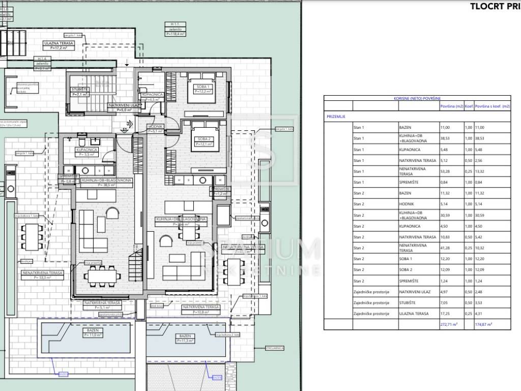 NJIVICE, ISLAND OF KRK, in an exclusive offer is a two-story apartment with a pool in a small new building. The area is 104.45 m2 and it is distributed as follows: kitchen with dining room and living room 38.55 m2, two bedrooms of 11.34 and 11.52 m2, two bathrooms of 5.48 and 4.78 m2, hallway 2.8 m2, storage room 0.84 m2, terrace of 66.10 m2, balcony 5.25 m2 and swimming pool of 11.30 m2. The apartment will be equipped with aluminum carpentry, first-class floor coverings and first-class sanitary facilities. Underfloor heating is installed via a heat pump, and a fan-coil system is used for cooling. Everything will be combined into a smart system, with which this innovative concept will improve the management of all devices and provide better system security and energy efficiency. In a quiet street, surrounded by family houses and luxurious new buildings, next to the green belt, this location offers everything you could wish for on vacation, as well as during a year-round stay. The planned completion of the works is August 2025. Experience a real summer vacation in the charming ambiance of a tourist resort right by the sea! Beautiful beaches, exceptionally blue sea, plenty of shade and a mild climate attract more and more guests to Njivice every year, which today are synonymous with family tourism. Once a small fishing village, Njivice is now a well-known tourist destination, a seaside place with a soul, which guests from European and other countries like to visit. For other information, please contact us with confidence. Azalea Kegalj Licensed agent +385 95 905 5464 azalea@spatium.hr Jana Hodak licensed agent 098/1671-888 jana@spatium.hr Spatium nekretnine +385 51 272 903 info@spatium.hr