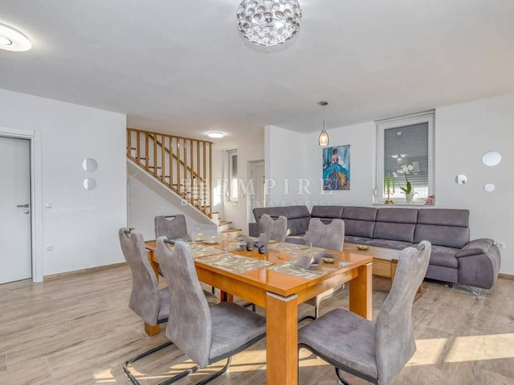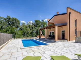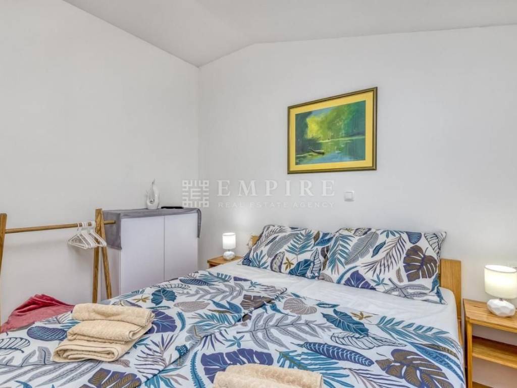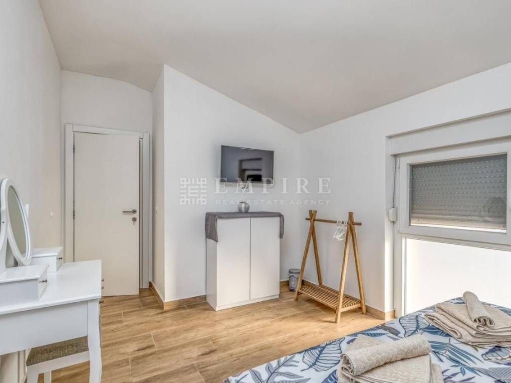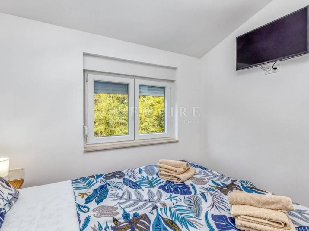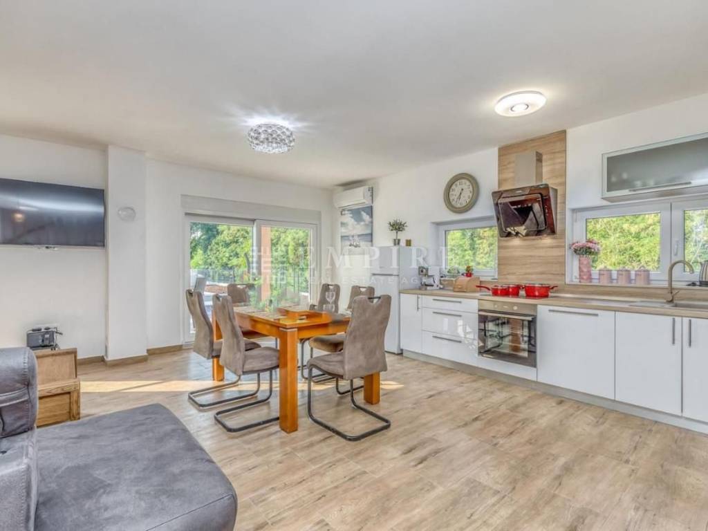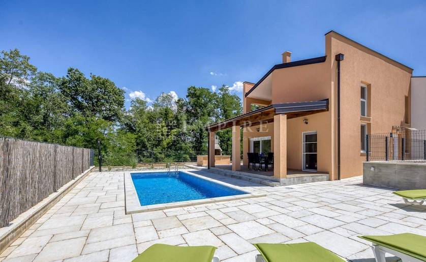 In the vicinity of Poreč, this modern semi-detached house is for sale, located on a plot of 353 m², with a total living area of 84 m² spread over two floors. On the ground floor, there is a spacious living room, an open-concept kitchen and dining area, and a bathroom. On the first floor, there are two comfortable bedrooms and an additional bathroom. The living area leads to a large covered terrace and a well-maintained garden, featuring a pool with a sunbathing zone and a barbecue, perfect for relaxation and outdoor gatherings. The house is equipped with air conditioning for heating and cooling, and the first phase of central heating is installed. The property is fully furnished and ready for immediate move-in. Located in a quiet area, yet close to all important amenities, this house is ideal for peaceful family living or successful tourist rental.