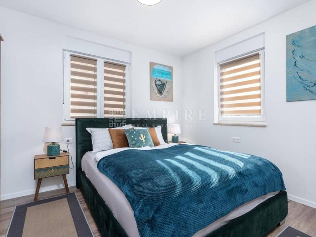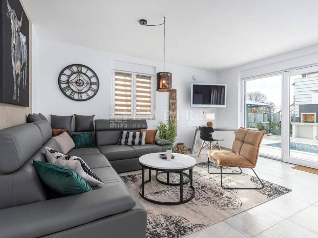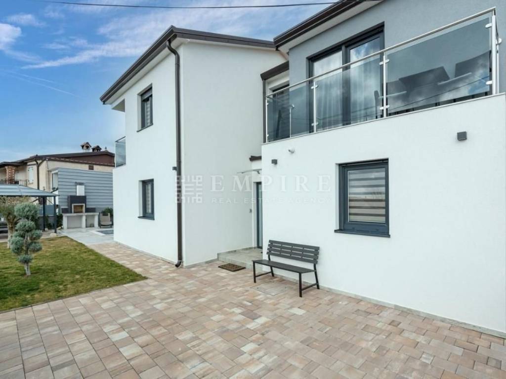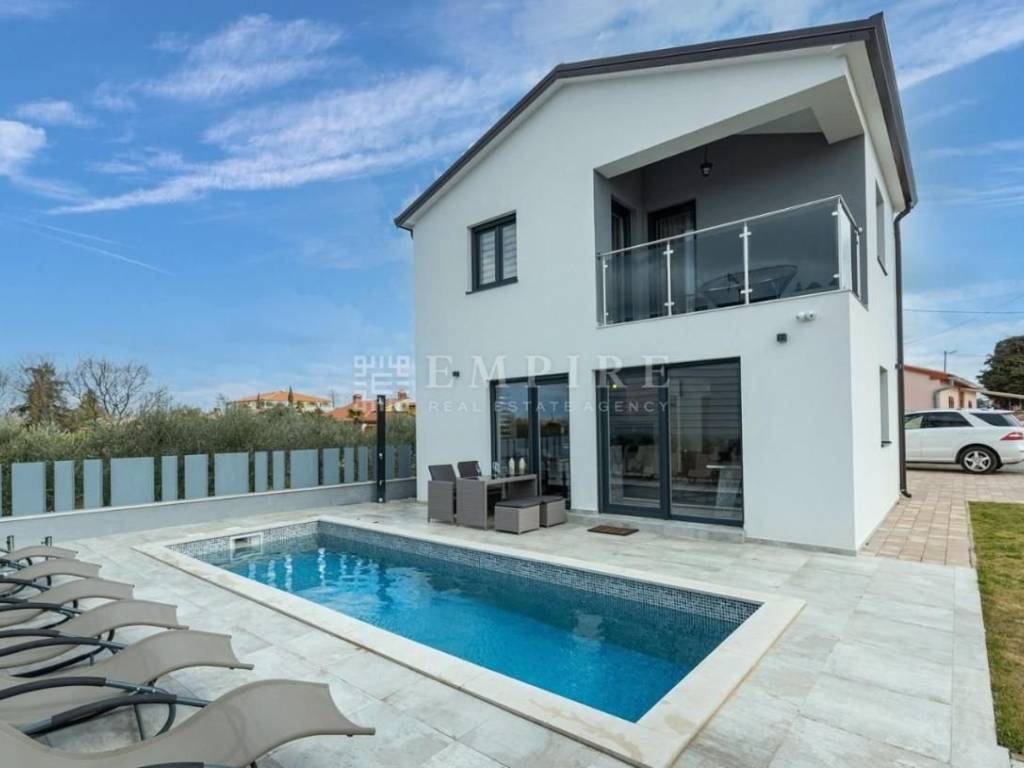 A beautiful modern house with a pool is for sale, located in a peaceful area near the town of Poreč and its beaches. This elegant property spans two floors and consists of a spacious living room, kitchen, and dining area in an open space concept, four large bedrooms, two of which have en-suite bathrooms, and additional rooms like a storage room. The living room is spacious, elegantly furnished, and filled with natural light thanks to large windows. The fully equipped and modernly designed kitchen is the heart of the home, perfect for preparing meals for family and friends. Heating is provided by air conditioners, and the pool is the ideal place to relax. The house is located in an area with all necessary amenities and is just 10 km from Poreč and its beaches. It is sold fully furnished.