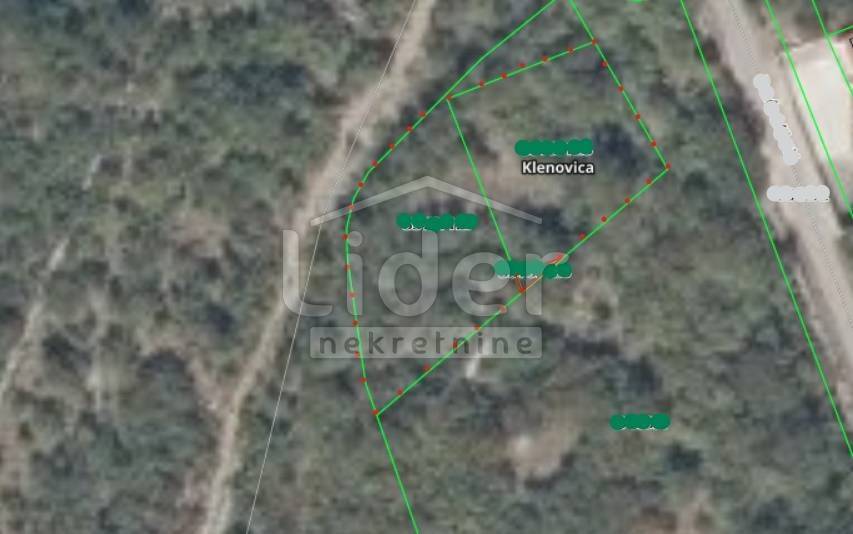 KLENOVICA Građevinsko zemljište od 852 m2 s pogledom na more, blago nakošeno, pravokutnog oblika, dim. 22 x 38 m, 800 m od morske obale, direktan prilaz. Priključci za vodu i struju nalaze se odmah pored zemljišta.
