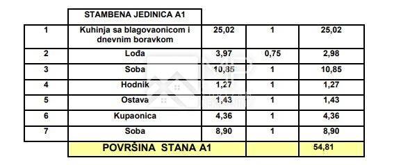 The apartment in question, marked "A1", is located on the first floor of the building (54.81 m2), and consists of a kitchen with a dining room and living room, a loggia, a hallway, two bedrooms, a utility room and a bathroom.