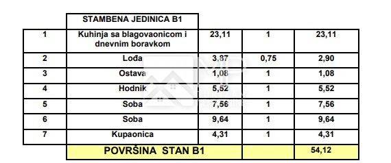 The apartment in question, marked "B1", is located on the first floor of the building (54.12 m2), and consists of a kitchen with a dining room and living room, a loggia, a hallway, two bedrooms, a utility room and a bathroom.