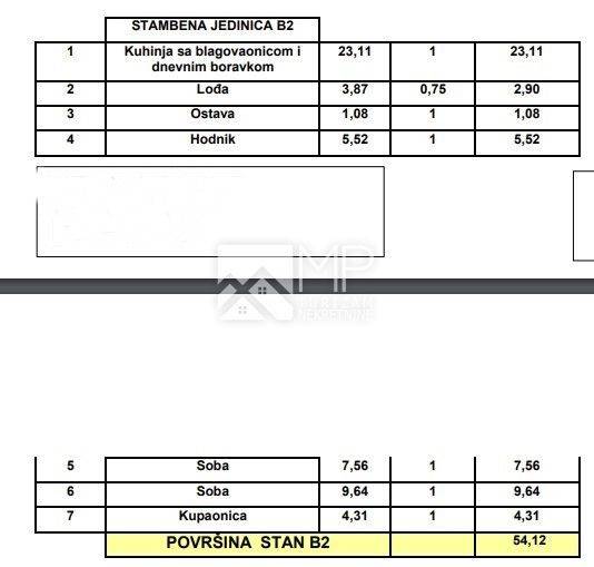 The apartment in question, marked "B2", is located on the 2nd floor of the building (54.12 m2), and consists of a kitchen with a dining room and living room, a loggia, a hallway, two bedrooms, a utility room and a bathroom.