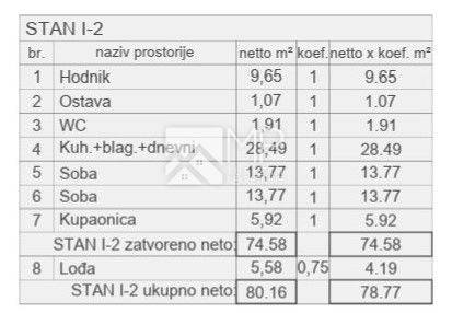 The apartment in question, marked "I-2", is located on the first floor of the building (78,77 m2), and consists of a hallway, kitchen with dining room and living room, two bedrooms, bathroom, toilet and loggia.