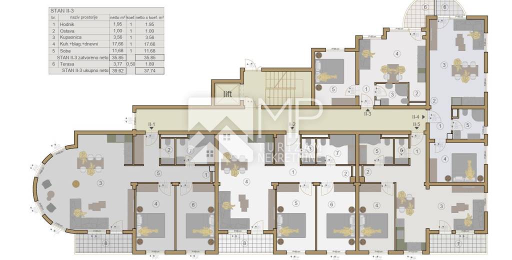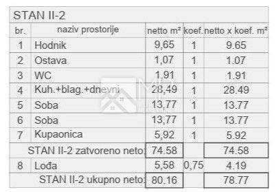 The apartment in question, marked "II-2", is located on the second floor of the building (78.77 m2), and consists of a hallway, kitchen with dining room and living room, two bedrooms, bathroom, toilet and loggia.