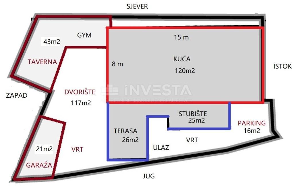 In the basement, there is street access to the building and the garage for one vehicle. The garage has an area of 21 m², and from the garage, you can access the courtyard of the building, where additional rooms and apartments are located. The yard is arranged as a garden terrace with an outdoor stone barbecue. The additional building in the yard, with an area of 43 m², is divided into a tavern for socializing, a large kitchen, a gym with several exercise machines, and a storage room.