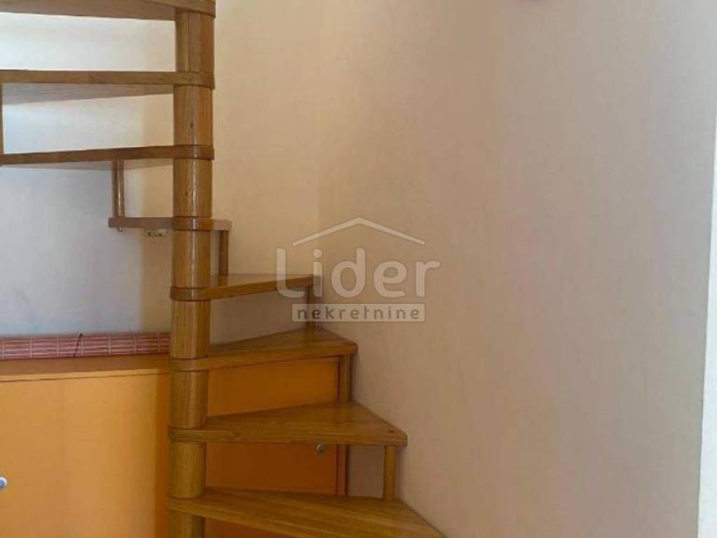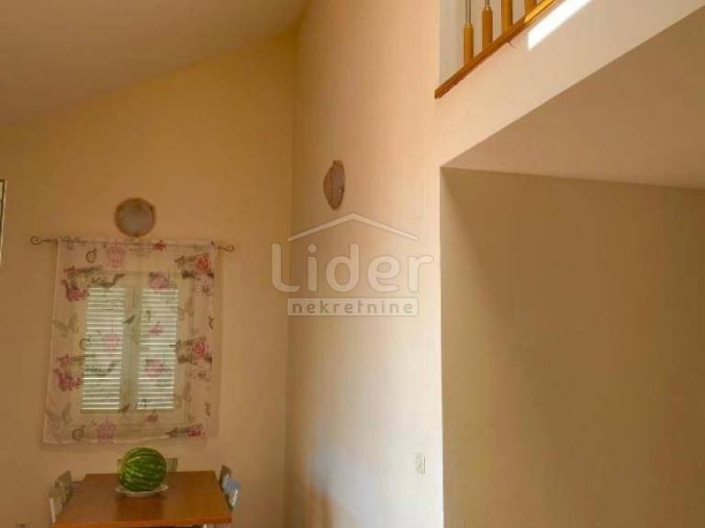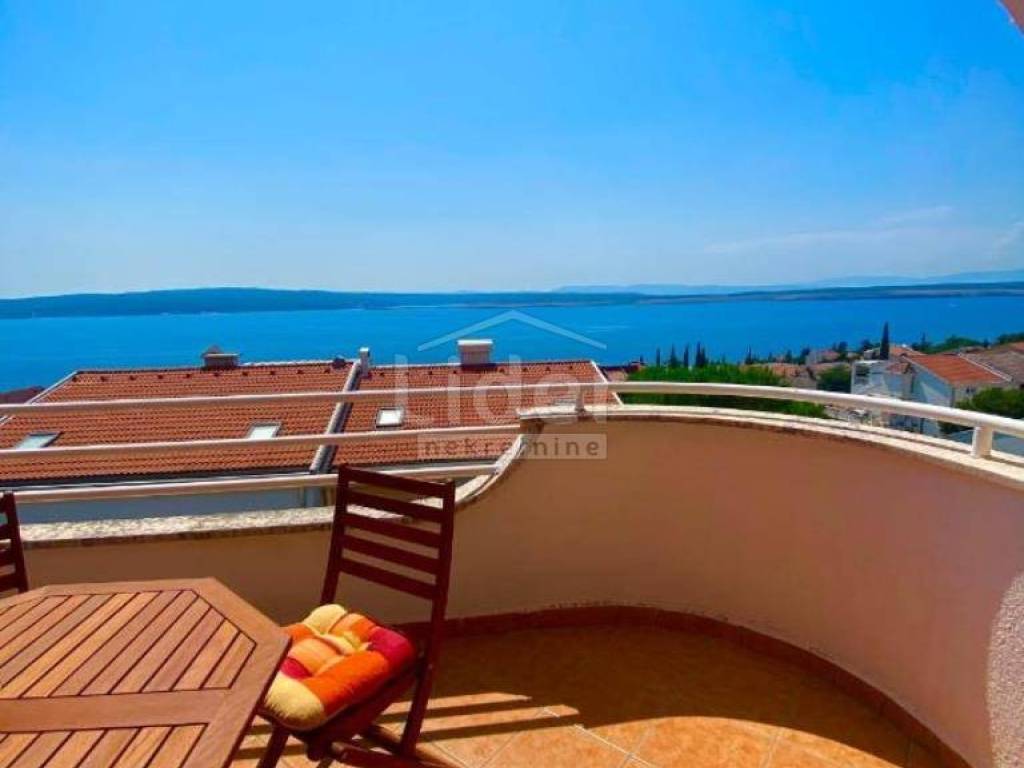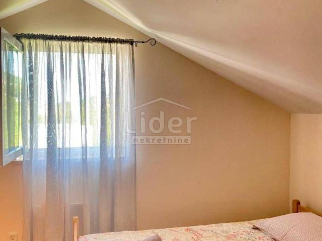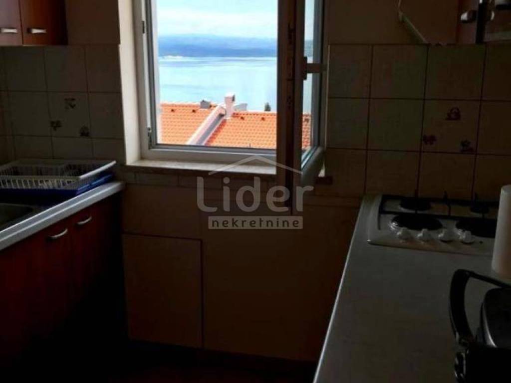 Dramalj, 300m from the sea, we offer an apartment spread over two floors: 2nd floor + high attic. On the 2nd floor (61m2) there are two bedrooms, a living room, a bathroom and a loggia, and in the high attic (21m2) there is another bedroom, a toilet and a storage room. Nice view of the sea. Secured parking space.