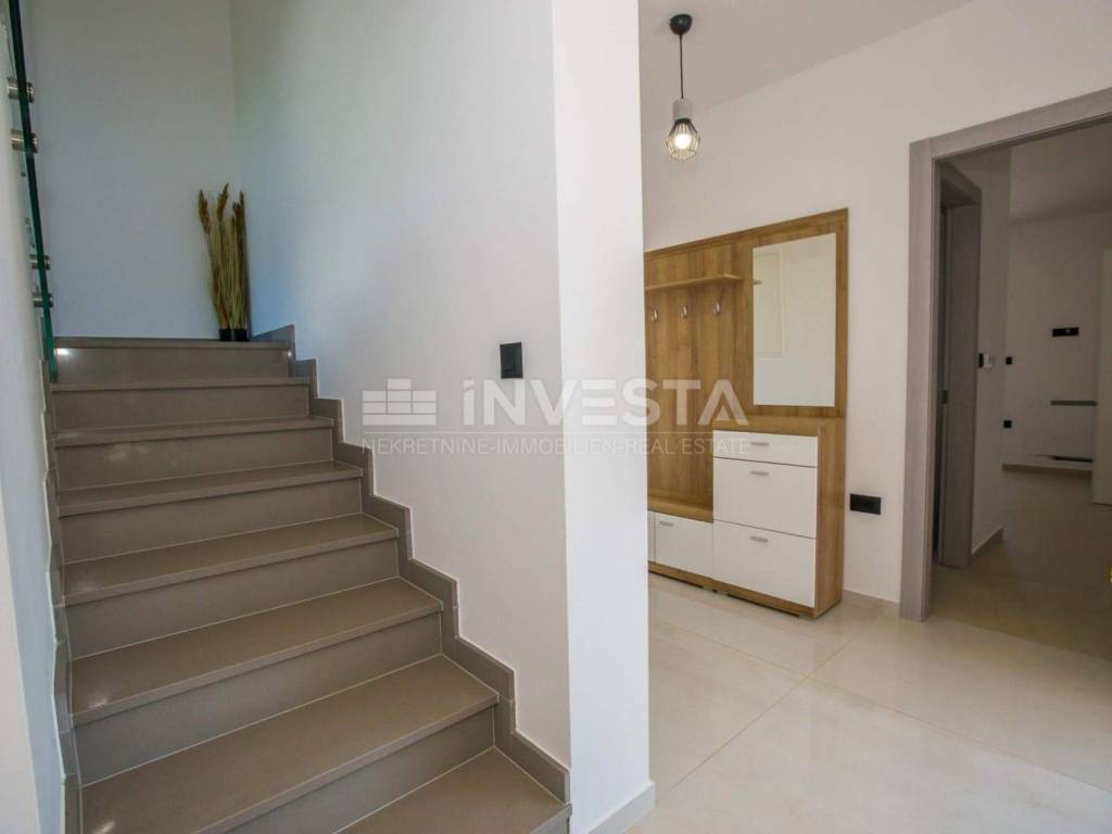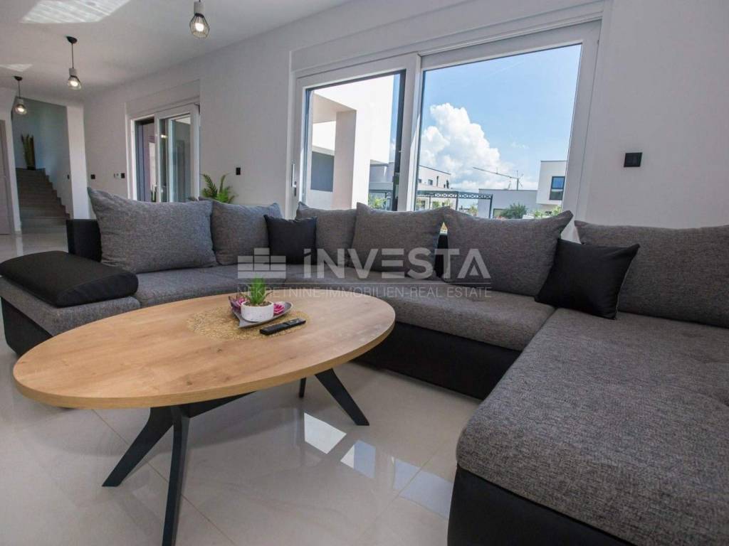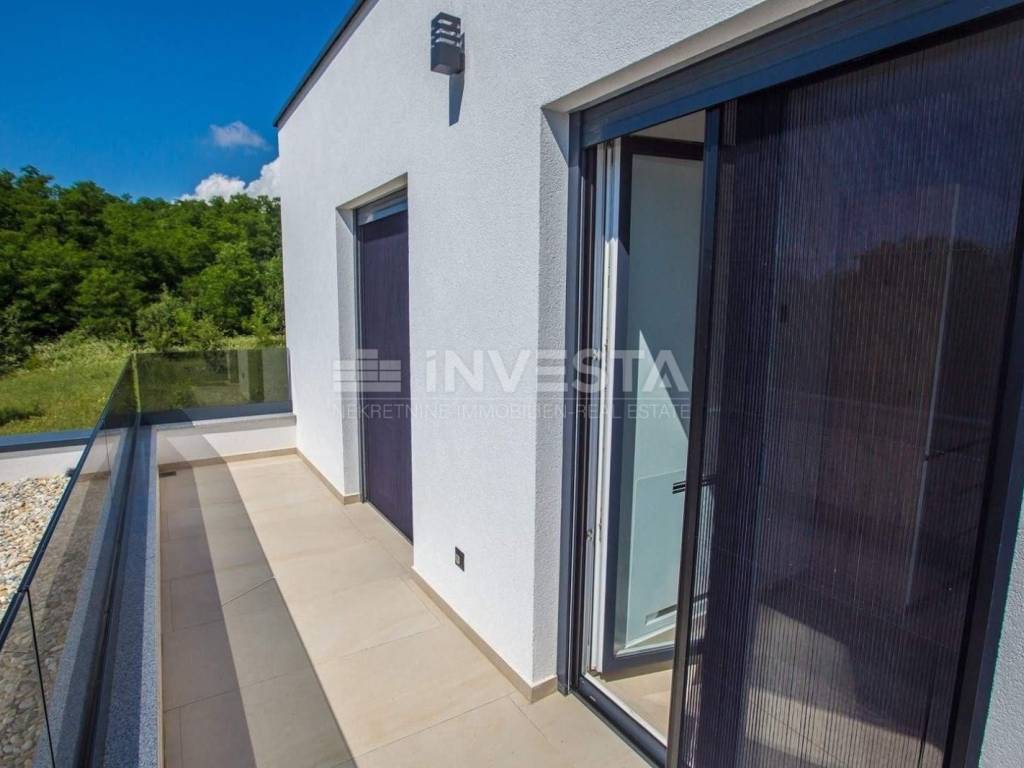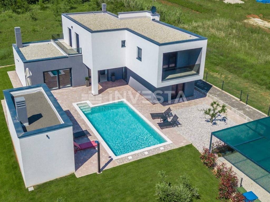 A modern villa of special design with an area of 215 m² is for sale in the vicinity of Poreč. It is situated on a plot of 766 m². The villa spans two floors: ground floor and first floor.