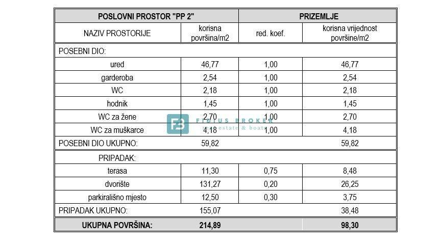 Poslovni prostor PP2 sastoji se od otvorenog prostora, garderobe, WC-a za osoblje, hodnika, WC-a za žene, WC-a za muškarce. Prostori su prepuni dnevnog svjetla i lijepi pogled na more i arhipelag.