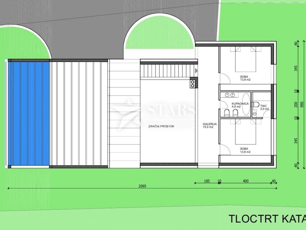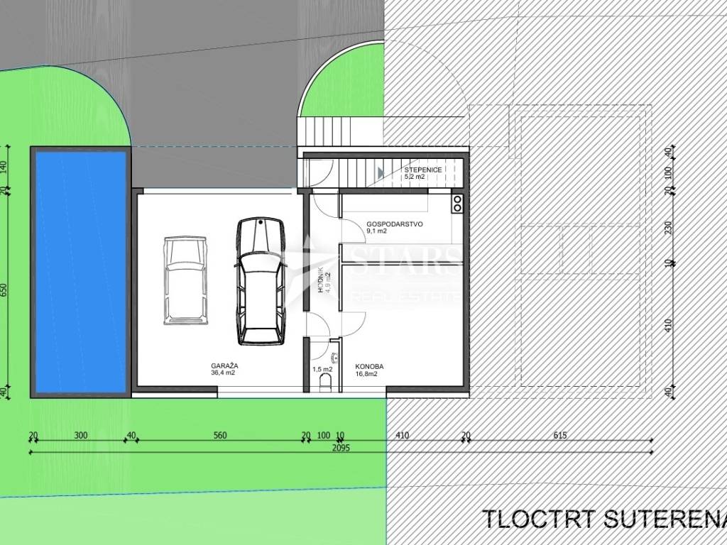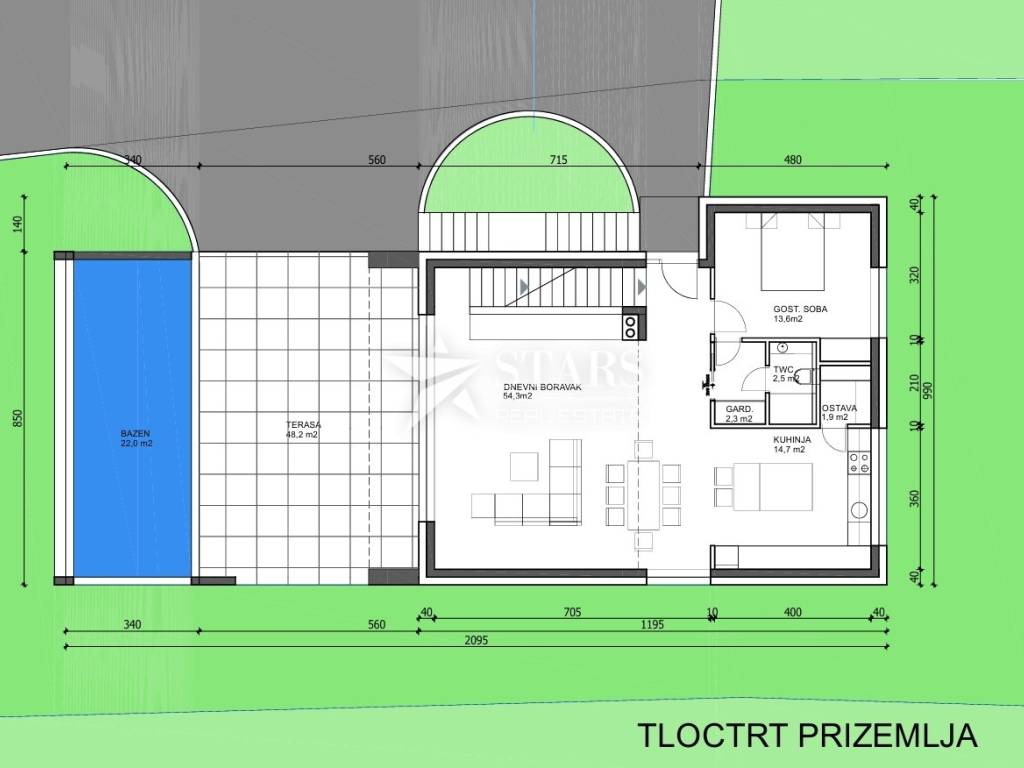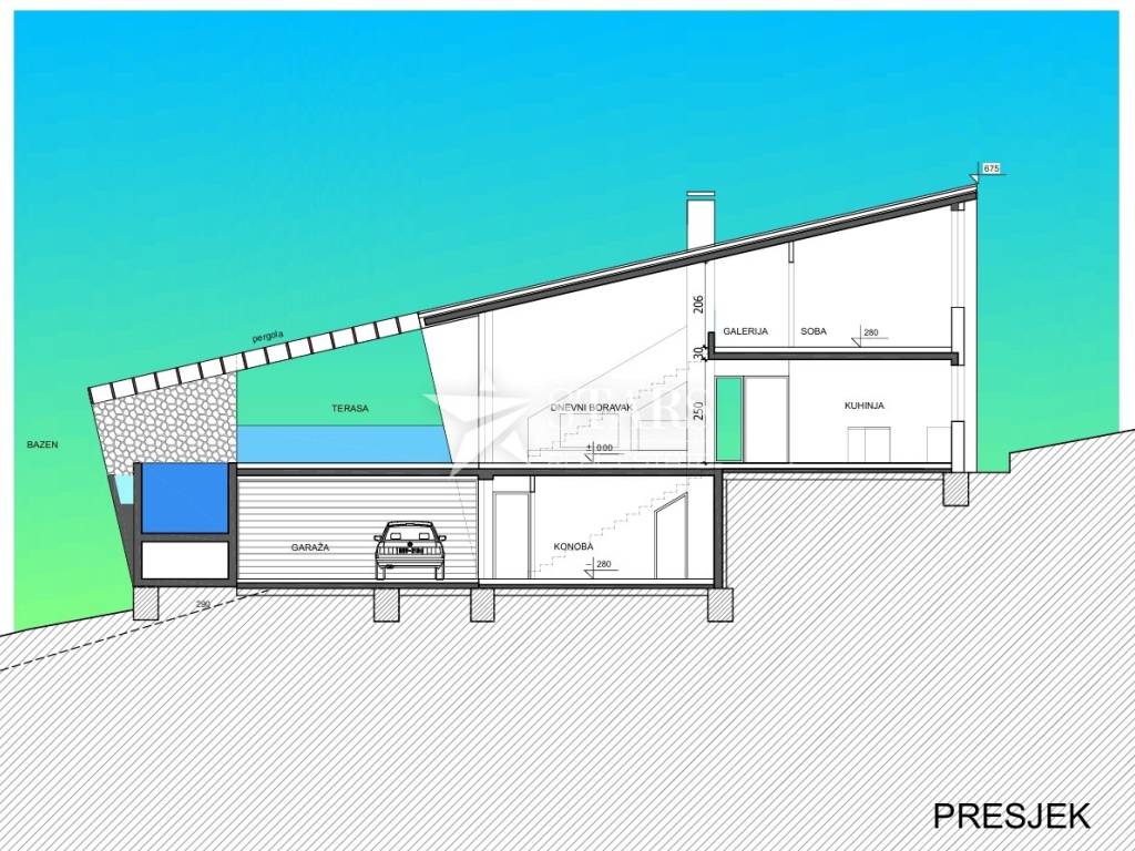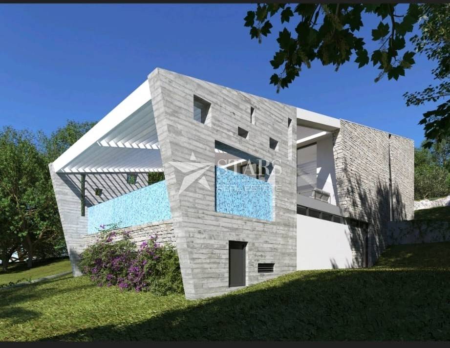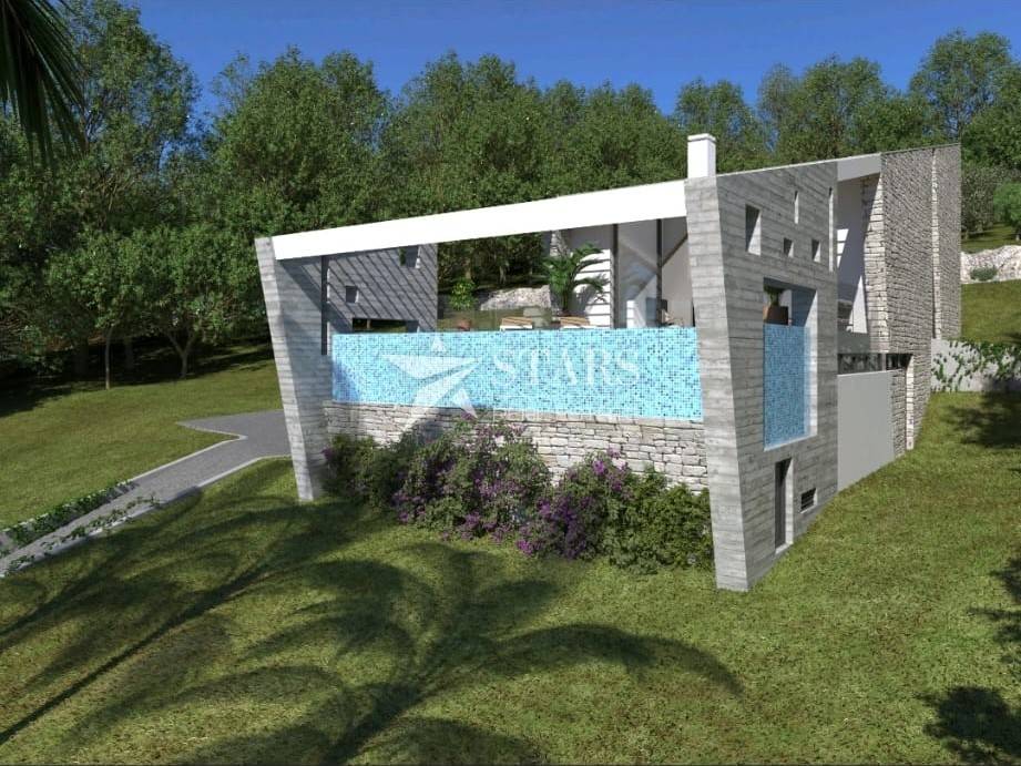 Na vrlo lijepoj lokaciji, teren veličine 1570 m2, od kojih je 850m2 građevinsko zemljište, sa izrađenim idejnim projektom za izgradnju moderne samostojeće kuće. Udaljen je od mora samo 800m, okružen zelenilom, pravokutnog je oblika, ima pristup sa asfaltnog puta i spreman je za početak gradnje. Idejnim projektom planirana je izgradnja kuće modernog dizajna: Suteren: garaža, gospodarstvo, kotlovnica, praonica i konoba s izlazom na teren. Prizemlje: prostrani dnevni boravak s kuhinjom i blagovaonicom, ulazni prostor, gostinjska soba s kupaonicom i garderobom. Kat: dvije spavaće sobe s kupaonicama, povezane s dnevnim boravkom putem galerije. Terasa: djelomično natkrivena terasa s bazenom iznad garaže.