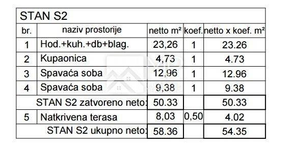 Apartment S2 has a total area of 54.35 m², with an indoor area of 50.33 m² and a covered terrace of 8.03 m². The apartment consists of: