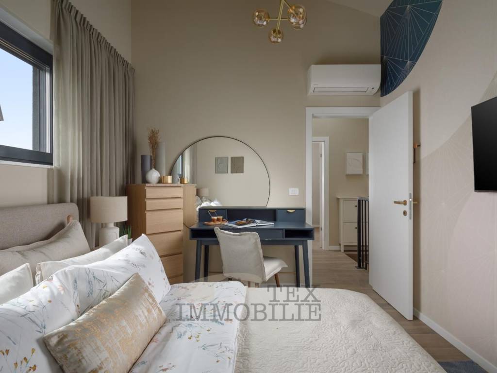 The internal staircase leads to the first floor, where you will find two bedrooms, a modernly designed bathroom, and a hallway connecting all the rooms.