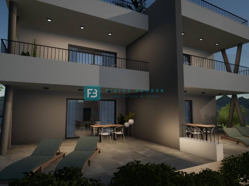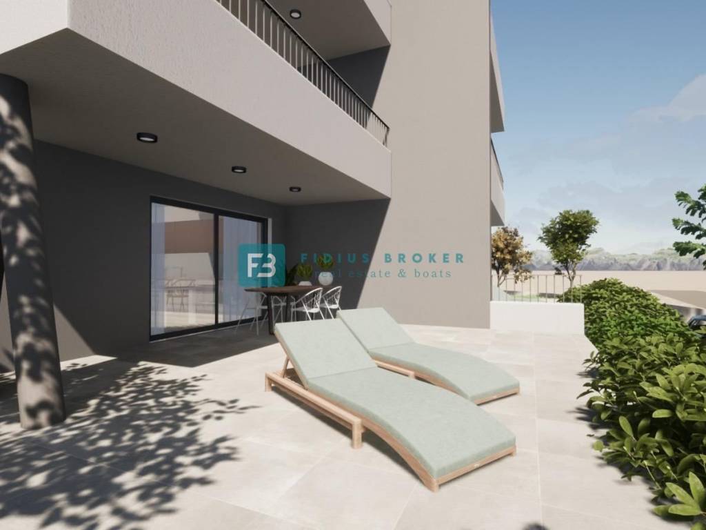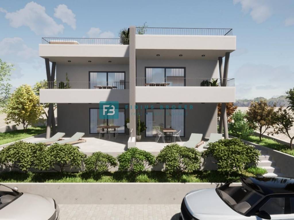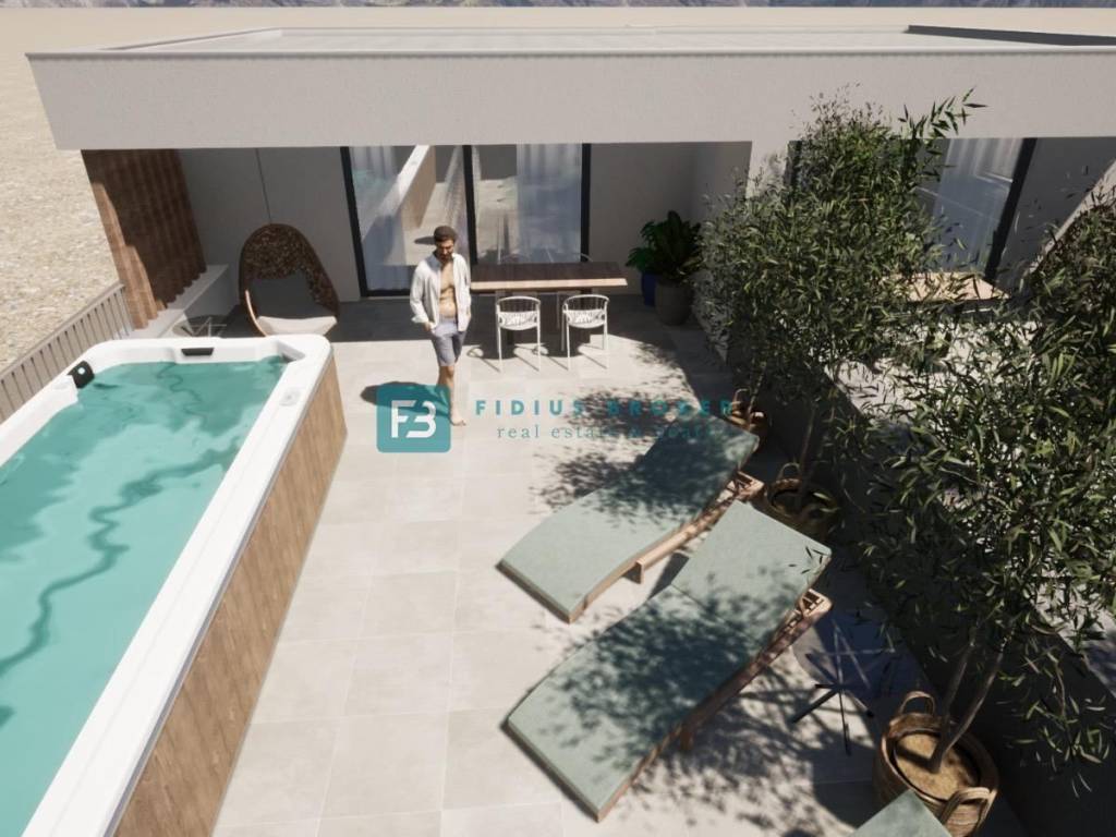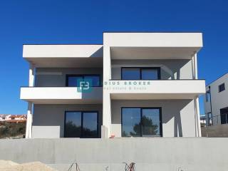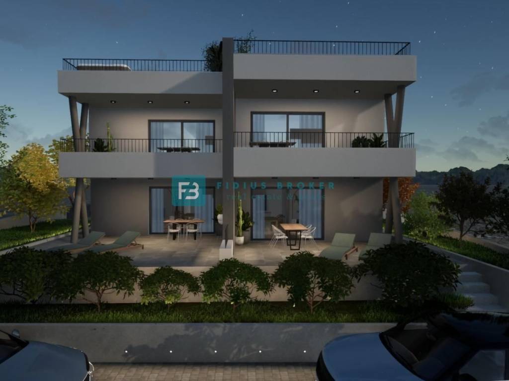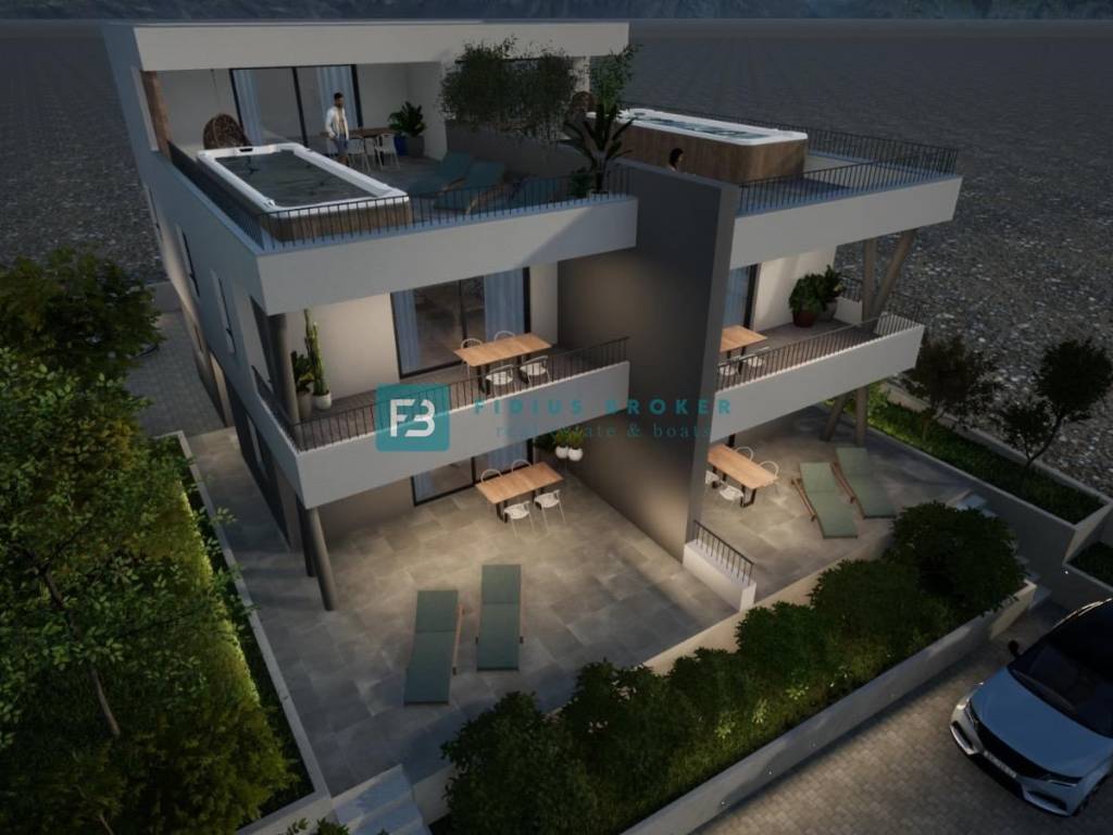 The property is located in a quiet location, 1600 m from the city center and 1800 m from the beach. A small residential building with a total of 4 apartments is under construction (two apartments with a garden on the ground floor and two two-storey apartments on the first floor with a roof terrace). The modern-looking residential building will consist of three floors: ground floor + 1st floor + 2nd floor (roof terrace). The building is being built with quality materials and will be equipped according to the latest construction standards: polystyrene facade, PVC joinery, burglar-proof and fire-proof entrance doors, roller shutters with electric lifts, mosquito nets, water-based electric underfloor heating in all rooms, high-quality ceramic floor coverings, modern bathroom fixtures, air conditioning in the bedrooms and living room. Planned completion date and move-in date: 06./2026.