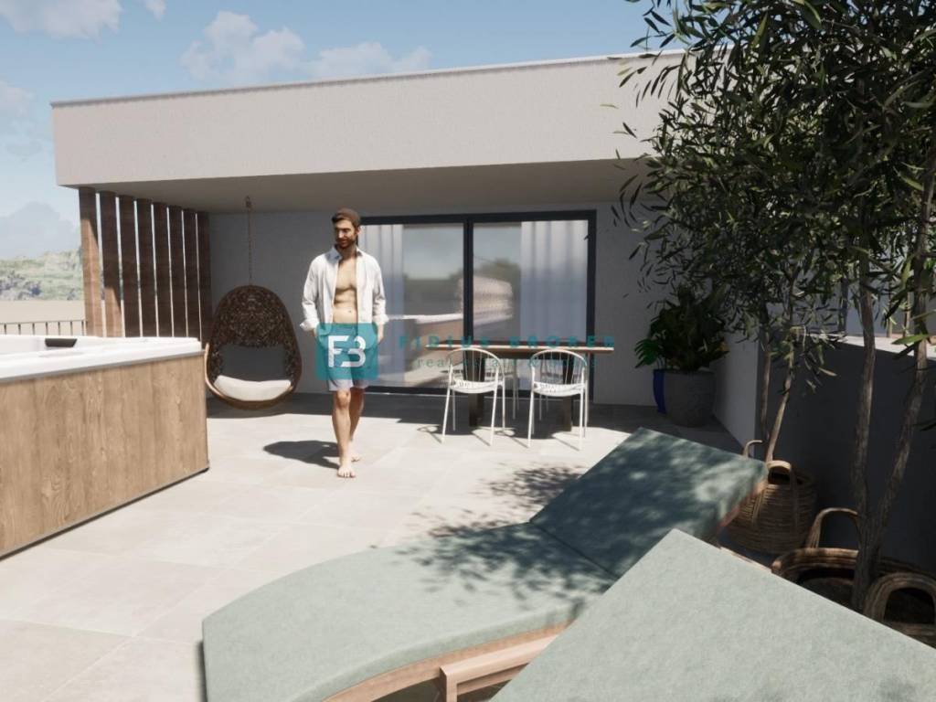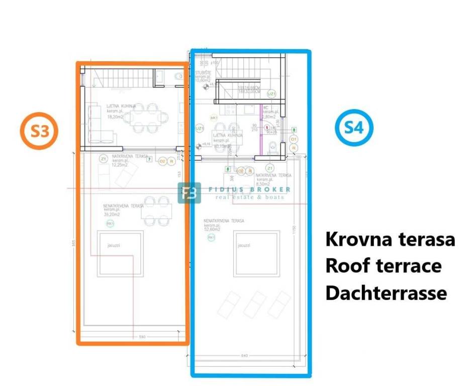 The duplex apartment S4 with a total net usable area of ​​99.57 m2 extends over two floors: 1st floor + 2nd floor. The first floor of the apartment consists of a hallway with a wardrobe, kitchen with dining room, living room that has access to a covered terrace of 12.50 m2, bathroom and two bedrooms. Internal stairs lead to the second floor of the apartment which consists of a summer kitchen and a toilet. From the summer kitchen there is access to a spacious, uncovered and covered terrace of 61.10 m2 with a beautiful view of the sea and the city. The apartment has one parking space. The price is €318,624.