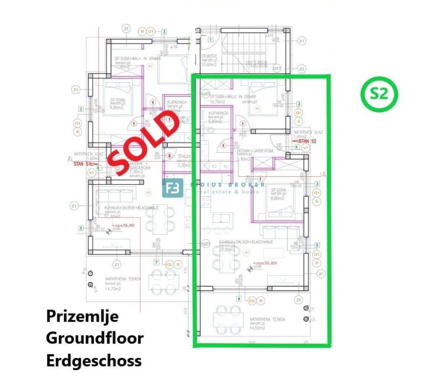 Apartment S2 with a total net usable area of ​​86.07 m2 is located on the ground floor. It consists of a covered entrance, hallway and cloakroom, kitchen with dining room and living room that has access to a covered and uncovered terrace of 44.99 m2 and a garden of 60.42 m2, bathroom, two bedrooms, one of which has a walk-in closet. The apartment has a separate entrance and two parking spaces. The price is €249,603.