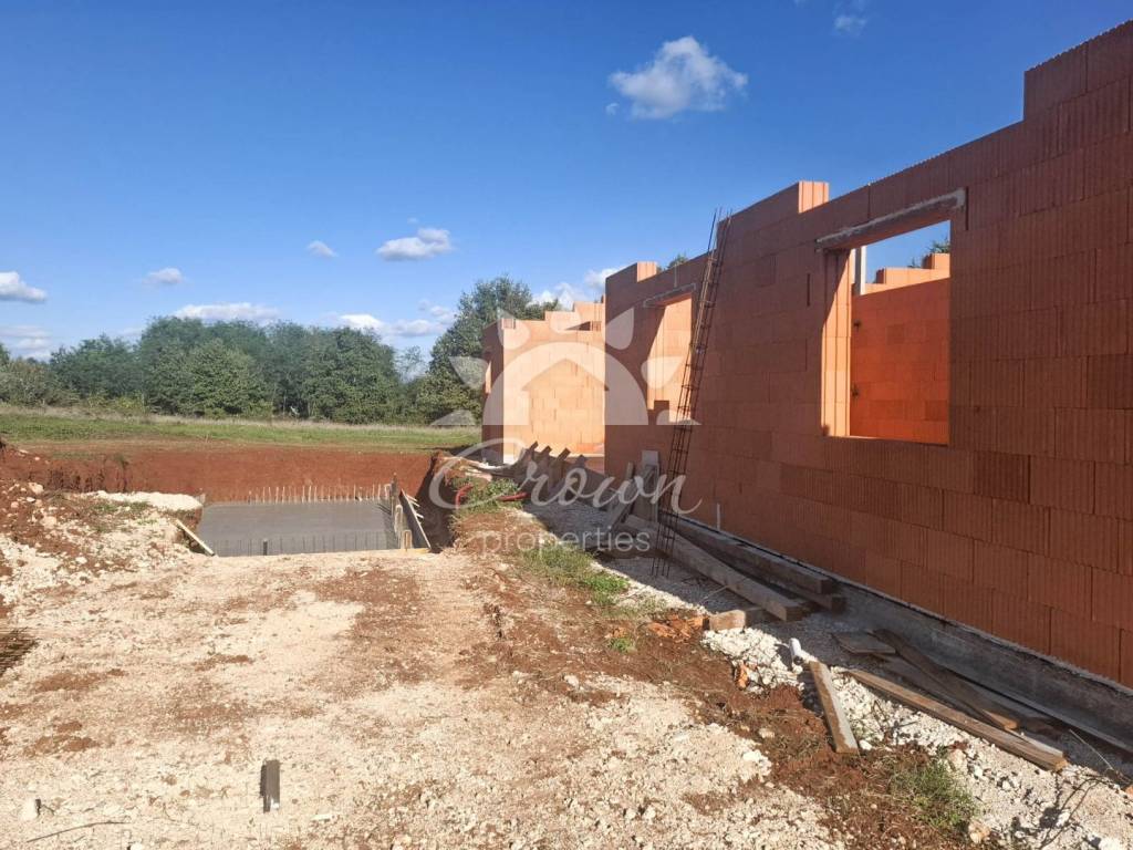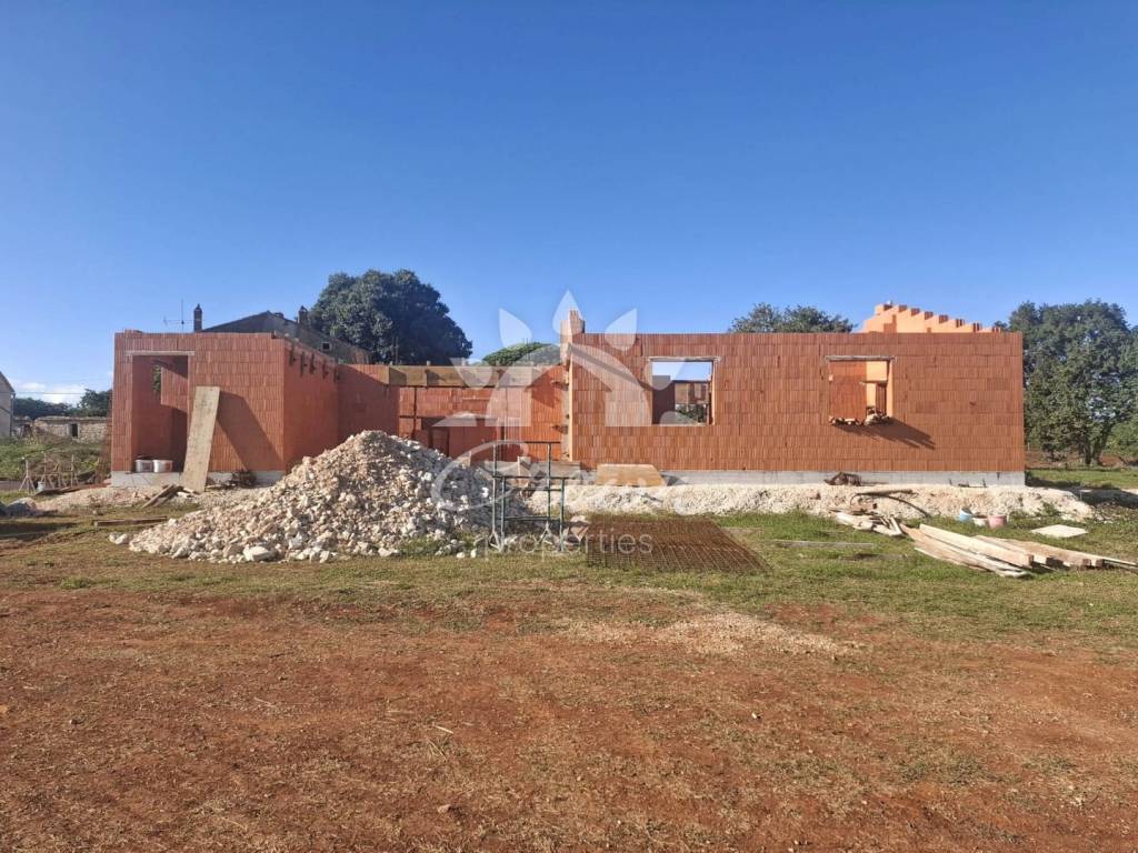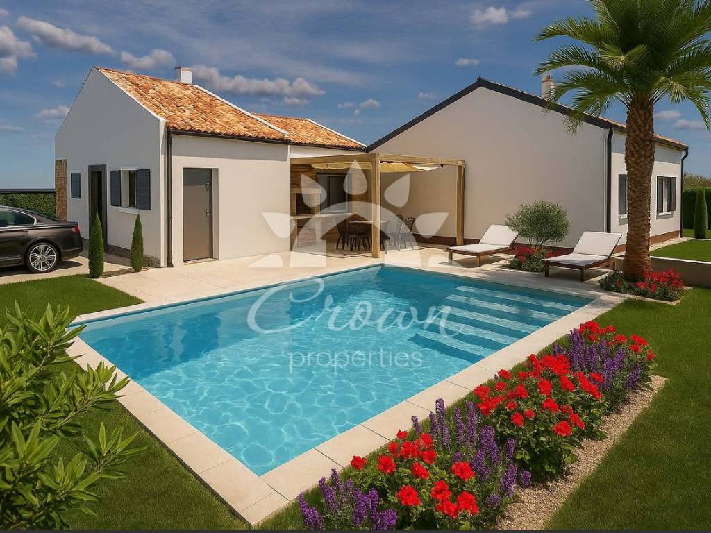 In the peaceful village of Kaštelir, just 10 km from Poreč and 4 km from the nearest beaches, a charming single-storey house is being built, combining modern comfort with Mediterranean lifestyle. Situated on a 900 m² plot, the house offers a total living area of 108.10 m².