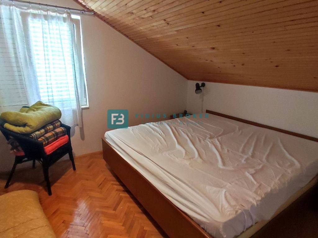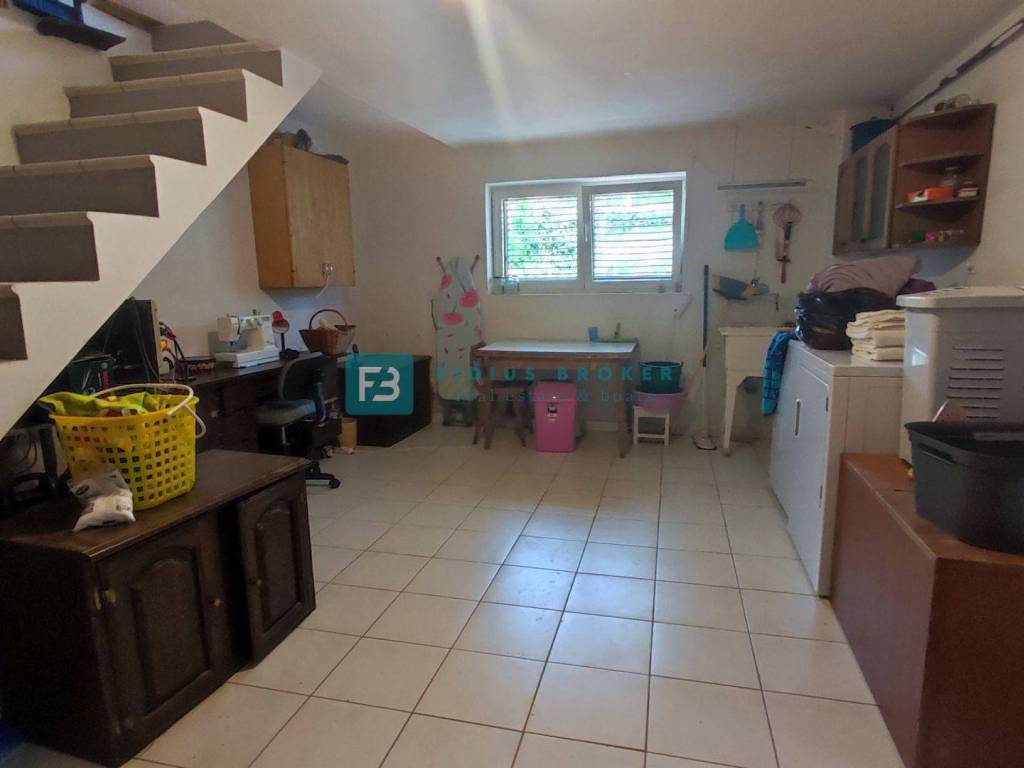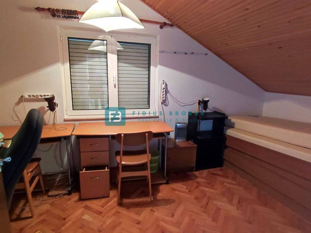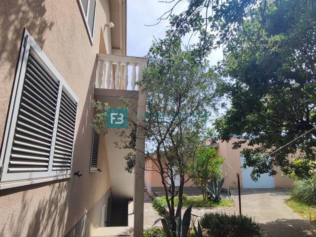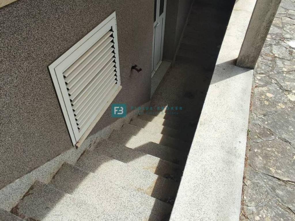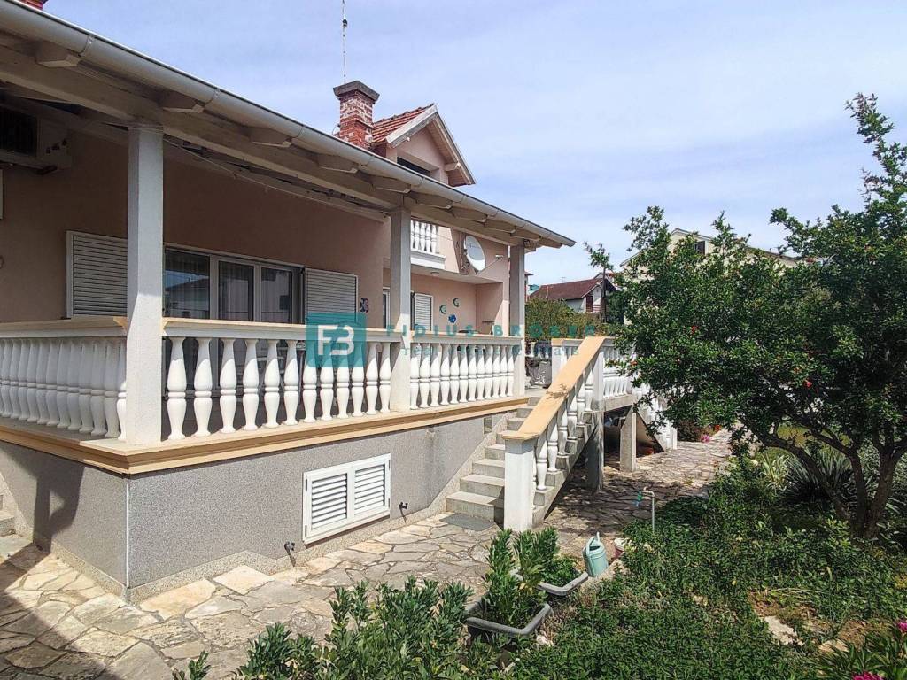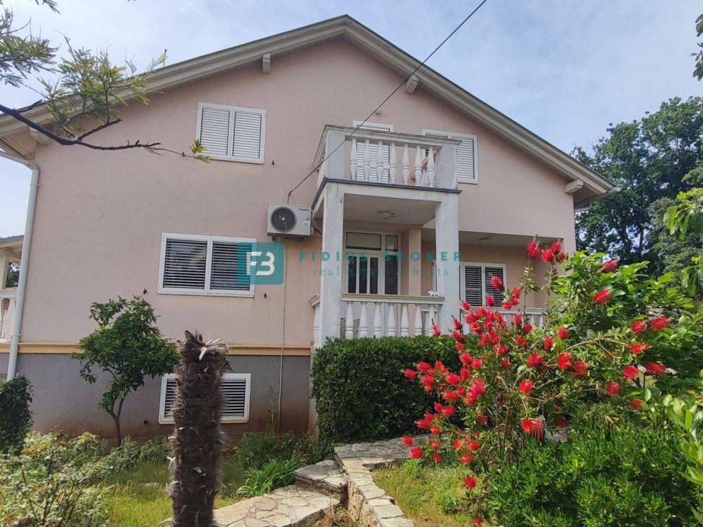 The detached house with a total gross area of ​​477.30 m2 (house with a gross area of ​​399.30 m2 + auxiliary building 78 m2) extends over three floors: basement + ground floor + attic. It was built in 1986 on a plot of land of 1185 m2 surrounded by a fence, a paved courtyard, an asphalt road, and city lighting. In the basement with an actual area of ​​101.62 m2 there is a garage, utility room, storage room and bathroom. On the ground floor with an actual area of ​​156.52 m2 there is a beautiful apartment that extends over the entire floor. It consists of a covered entrance, hallway, loggia, two bedrooms, one of which has its own bathroom and walk-in closet, storage room, toilet, open space kitchen with dining room, living area with access to a beautiful covered and uncovered terrace of 47.07 m2. From the terrace, an external staircase leads to a beautifully landscaped garden. The entrance to the upper floor is via an external staircase. In the attic of actual area 141.16 m2, there are two apartments. Each consists of two bedrooms, a bathroom, a small kitchen and a living area. One apartment has a loggia with a sea view. In the spacious courtyard there is also an auxiliary building of actual area 78 m2 that can be converted into a separate apartment. The courtyard is large enough to install a swimming pool if desired. There is also a barbecue in the courtyard.