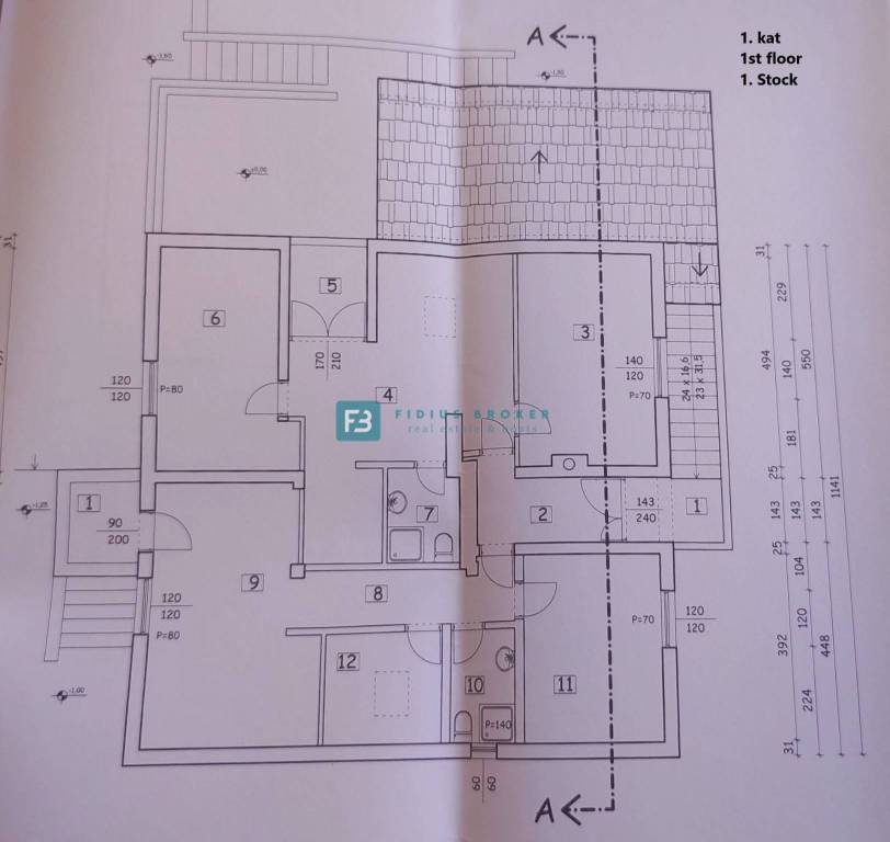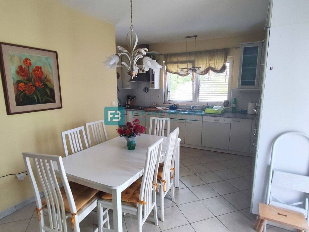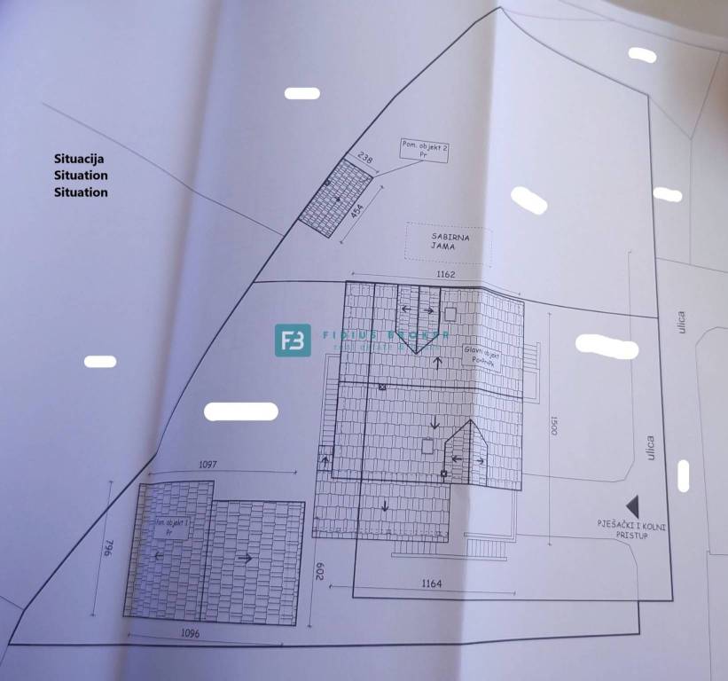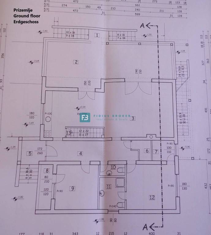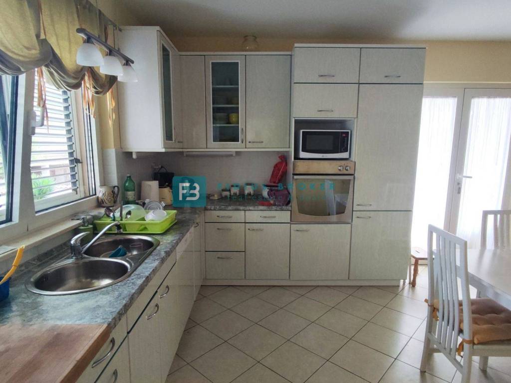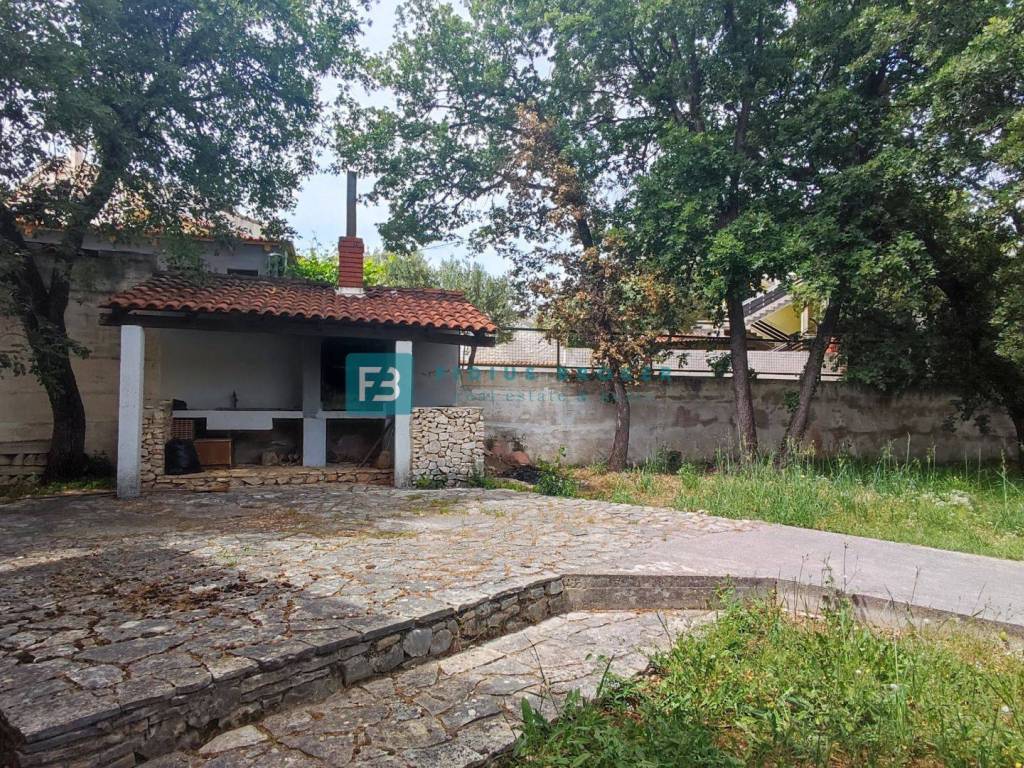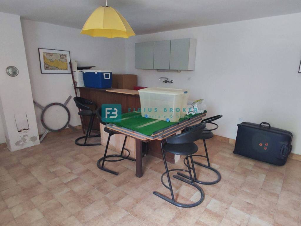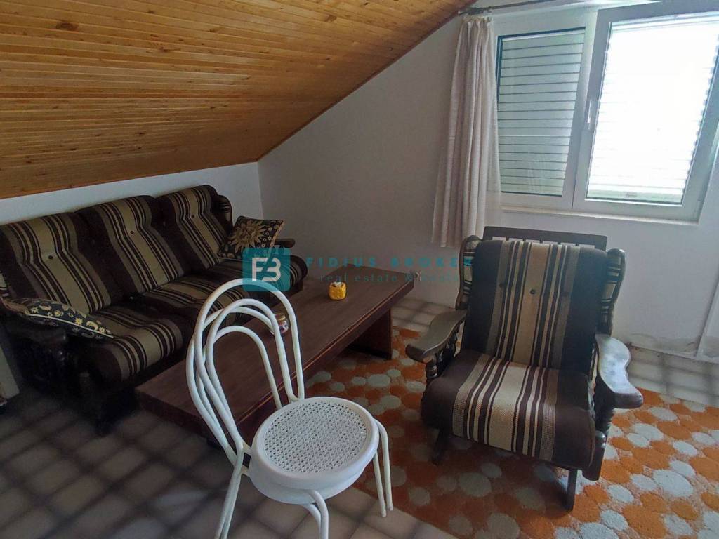 The detached house with a total gross area of ​​477.30 m2 (house with a gross area of ​​399.30 m2 + auxiliary building 78 m2) extends over three floors: basement + ground floor + attic. It was built in 1986 on a plot of land of 1185 m2 surrounded by a fence, a paved courtyard, an asphalt road, and city lighting. In the basement with an actual area of ​​101.62 m2 there is a garage, utility room, storage room and bathroom. On the ground floor with an actual area of ​​156.52 m2 there is a beautiful apartment that extends over the entire floor. It consists of a covered entrance, hallway, loggia, two bedrooms, one of which has its own bathroom and walk-in closet, storage room, toilet, open space kitchen with dining room, living area with access to a beautiful covered and uncovered terrace of 47.07 m2. From the terrace, an external staircase leads to a beautifully landscaped garden. The entrance to the upper floor is via an external staircase. In the attic of actual area 141.16 m2, there are two apartments. Each consists of two bedrooms, a bathroom, a small kitchen and a living area. One apartment has a loggia with a sea view. In the spacious courtyard there is also an auxiliary building of actual area 78 m2 that can be converted into a separate apartment. The courtyard is large enough to install a swimming pool if desired. There is also a barbecue in the courtyard.
