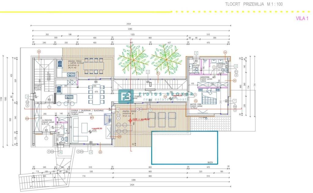 GROUND FLOOR - gross/net area = 211.35 m2 / 170.11 m2 consists of an entrance, toilet, kitchen and dining room, living room with access to a terrace of 37.20 m2 where there is a swimming pool and sundeck, an outdoor terrace of 24.10 m2 with a summer kitchen, a toilet with an entrance from the outside, a hallway, staircase, master bedroom with a dressing room and a private bathroom.