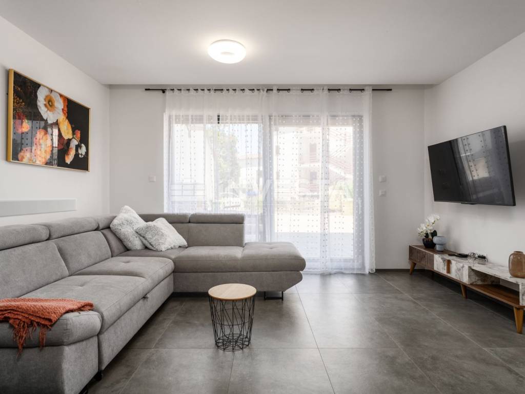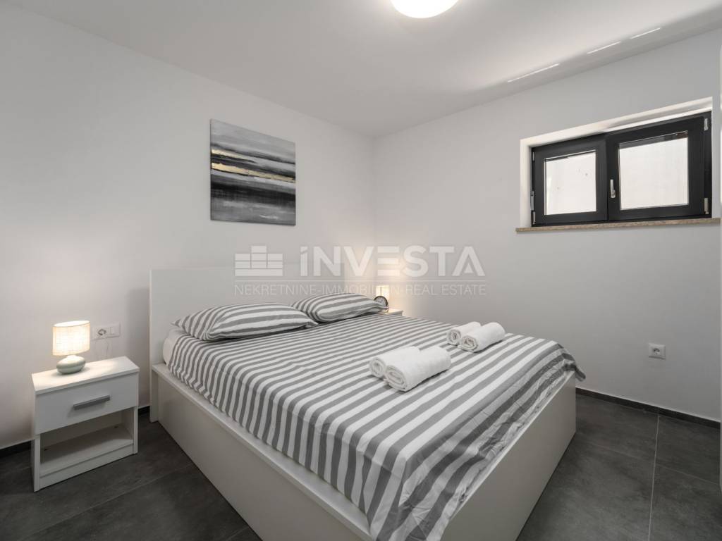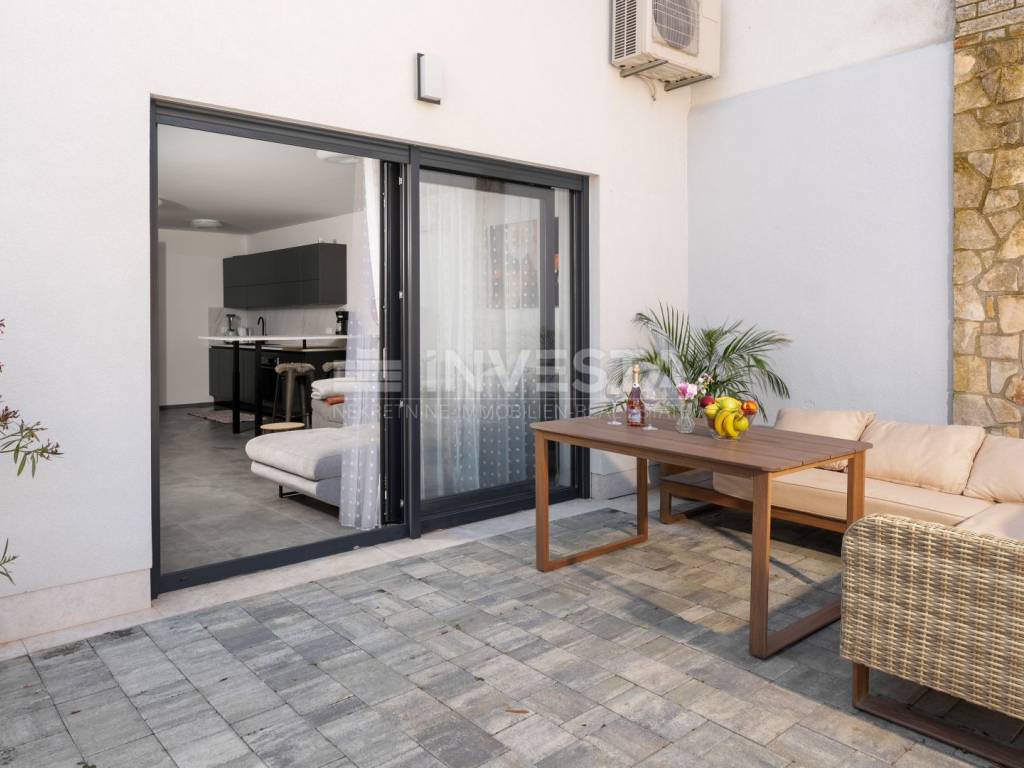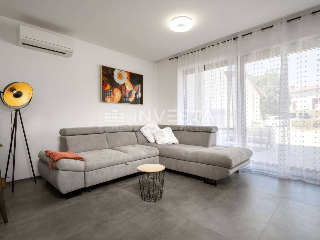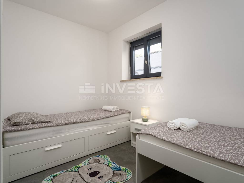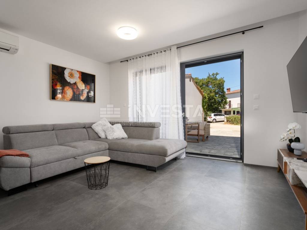 Located in a quiet and well-maintained area of a small fishing town near Poreč, this exceptionally high-quality and comfortable apartment is situated on the ground floor of a modern residential building constructed in 2022, only 700 meters from the sea and coastline.