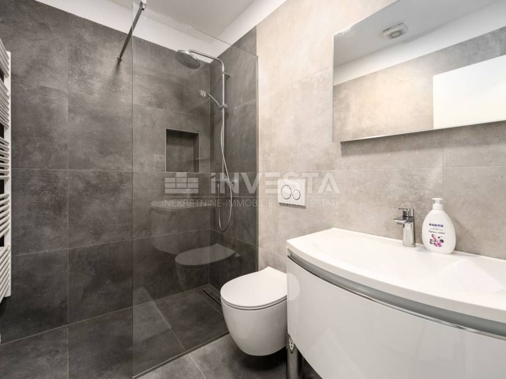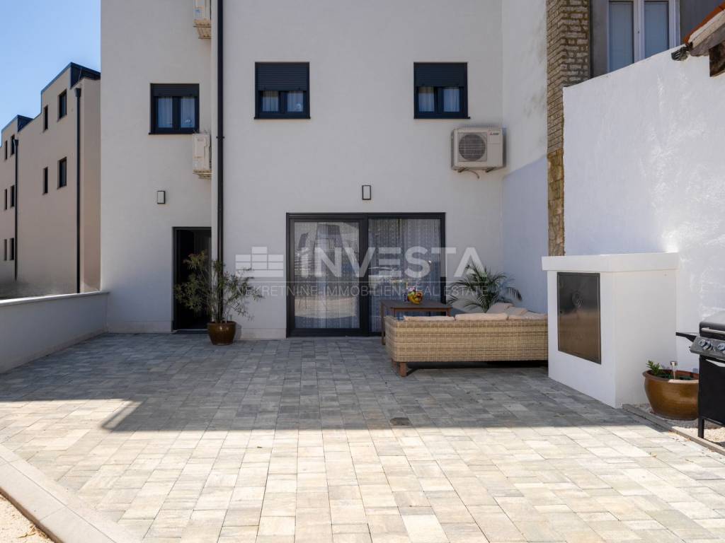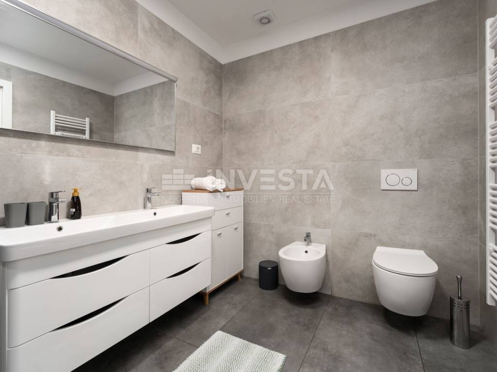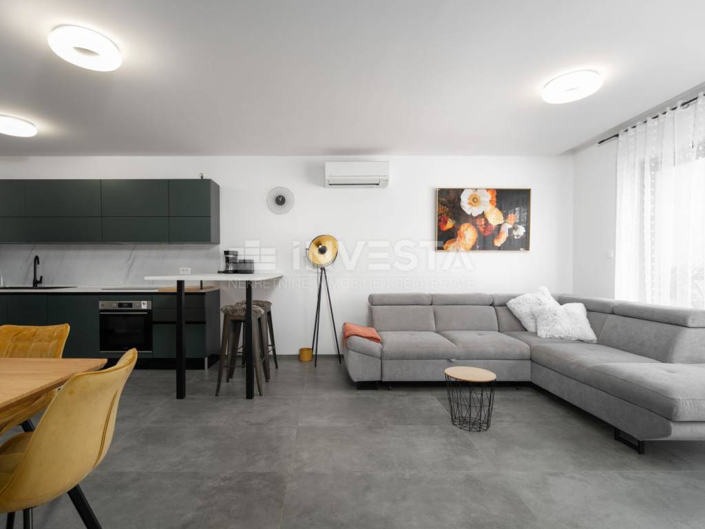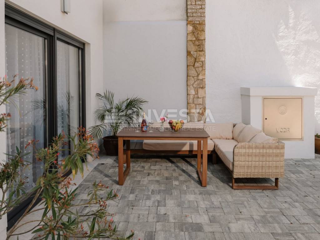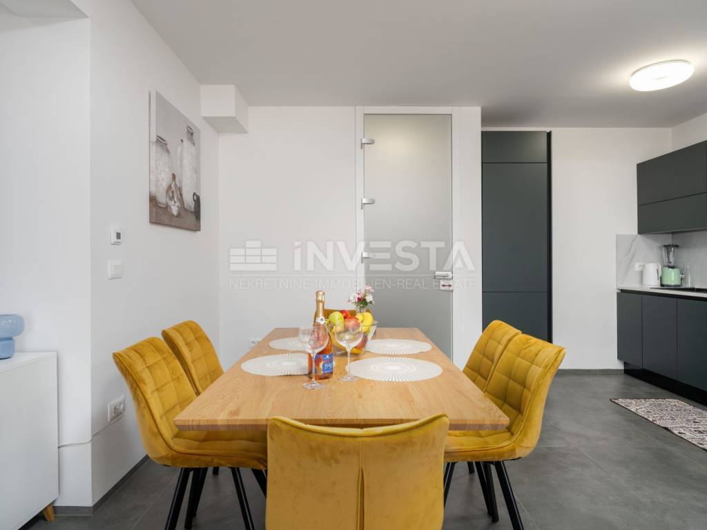 Located in a quiet and well-maintained area of a small fishing town near Poreč, this exceptionally high-quality and comfortable apartment is situated on the ground floor of a modern residential building constructed in 2022, only 700 meters from the sea and coastline.