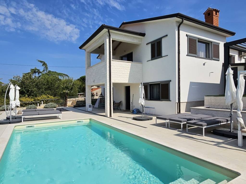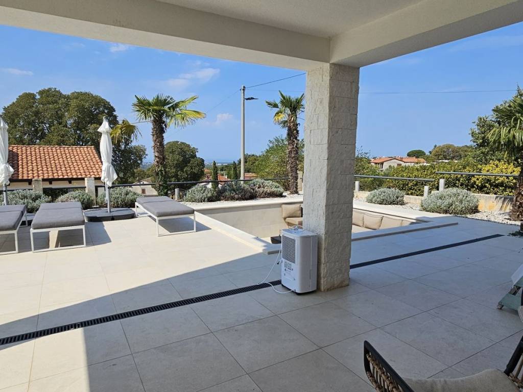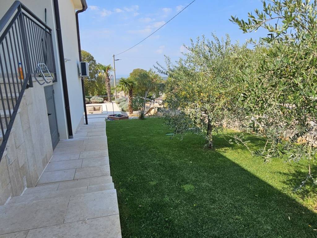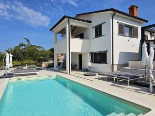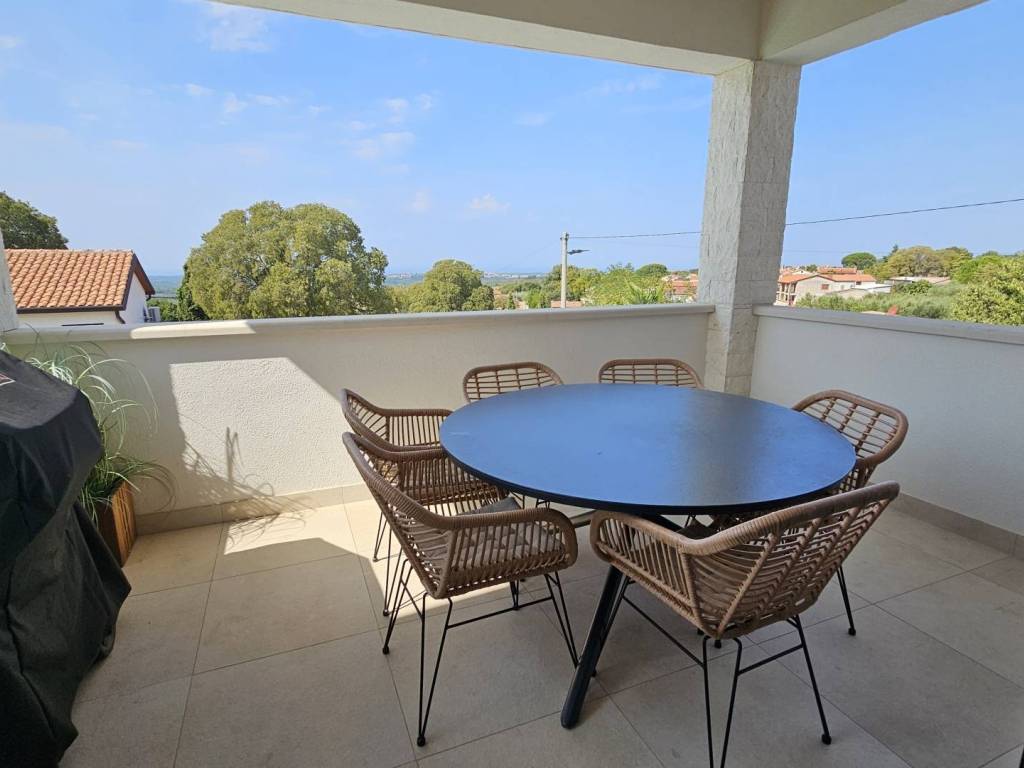 On the first floor, the house consists of a kitchen, dining room and living room, all in an open space area with access to the terrace with a beautiful view of the sea and the city of Poreč, then we have 3 bedrooms and two bathrooms.