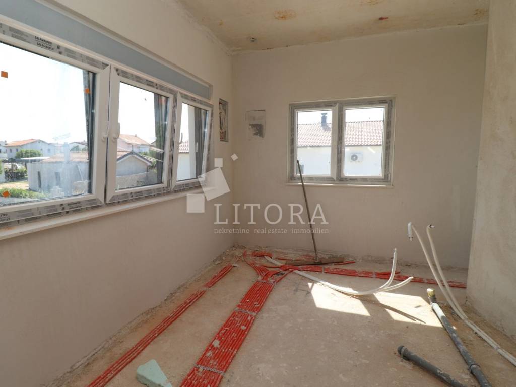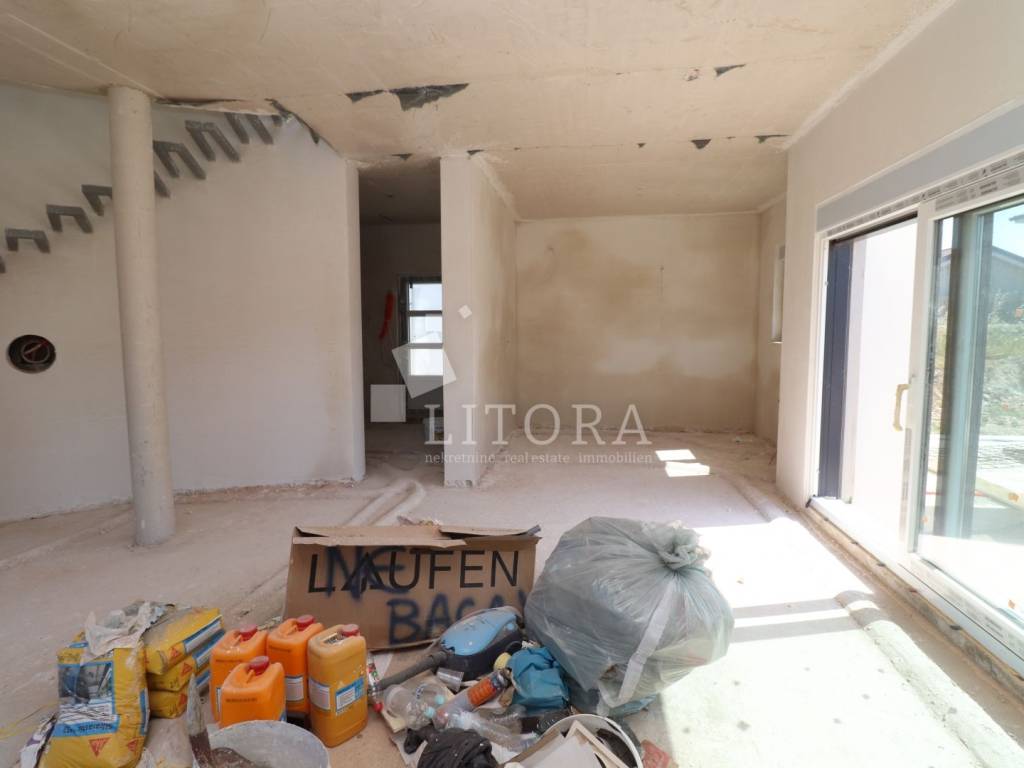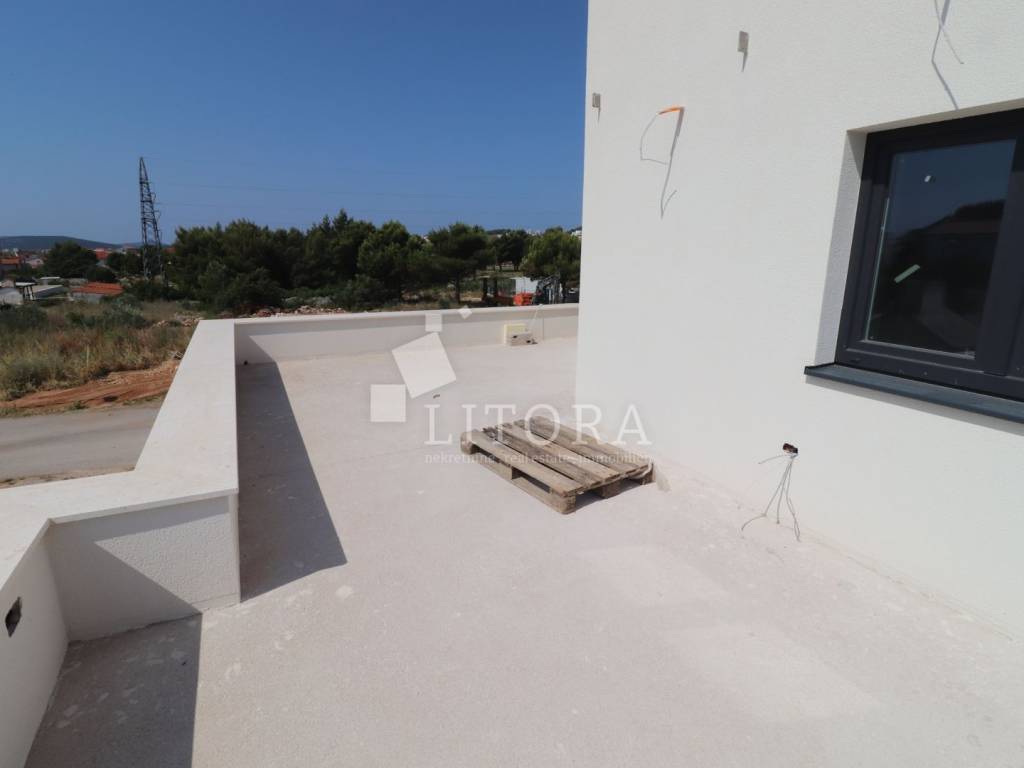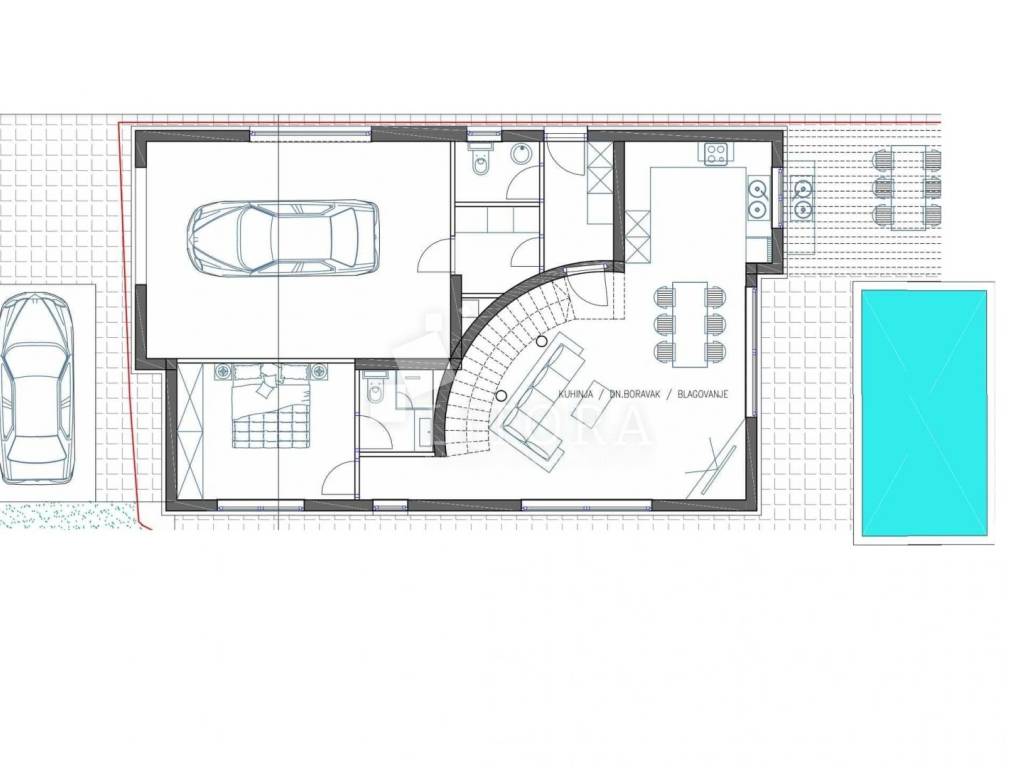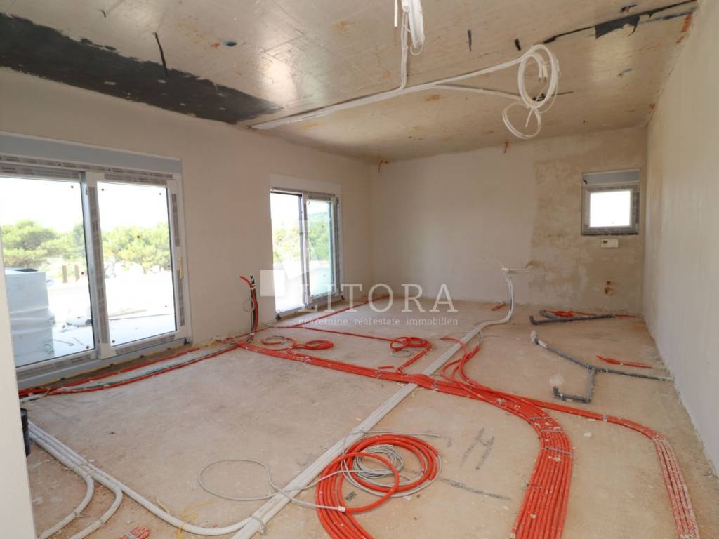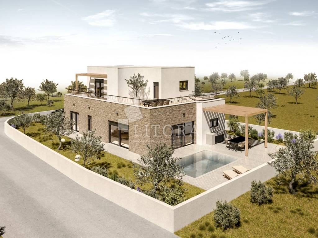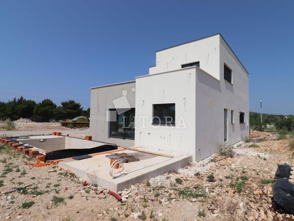 Vodice – newly built villa with pool, garage, and beautifully landscaped yard. The villa features modern and contemporary architecture, with a total area of 176.40 m² and a 19 m² pool. It consists of two levels – ground floor and first floor – and is built on a plot of 497 m². The ground floor includes an entrance hall, storage/wardrobe, guest toilet, one bedroom with en-suite bathroom, and the main living area – an open-concept kitchen, dining, and living room with access to a spacious terrace featuring an outdoor kitchen/bar, sun deck, and pool. There is also a spacious garage on the ground floor with an area of 35 m². Upstairs, there is a hallway and two large bedrooms, each with its own bathroom and access to a spacious terrace. The yard will be fully fenced, partially paved, and partially landscaped with greenery. In addition to the garage, two more outdoor parking spaces are planned. The property is equipped with high-quality features: electric roller shutters, triple-glazed windows, large sliding glass doors, mosquito screens, air conditioning units in each room, chimney prepared for a possible fireplace, underfloor heating throughout the living space with a heat pump, and a security entrance door. The villa is in the final phase of construction, with completion expected by the end of 2025. Distance from the town center is 1,100 m and from the Vruje pebble beach 1,450 m.
