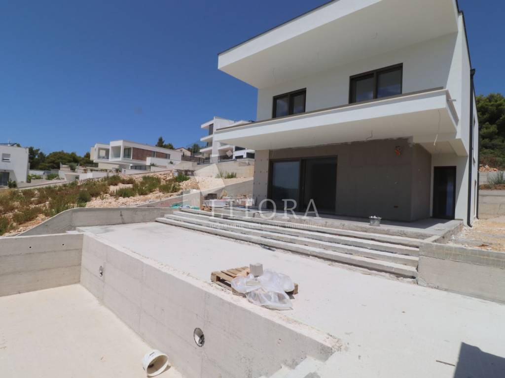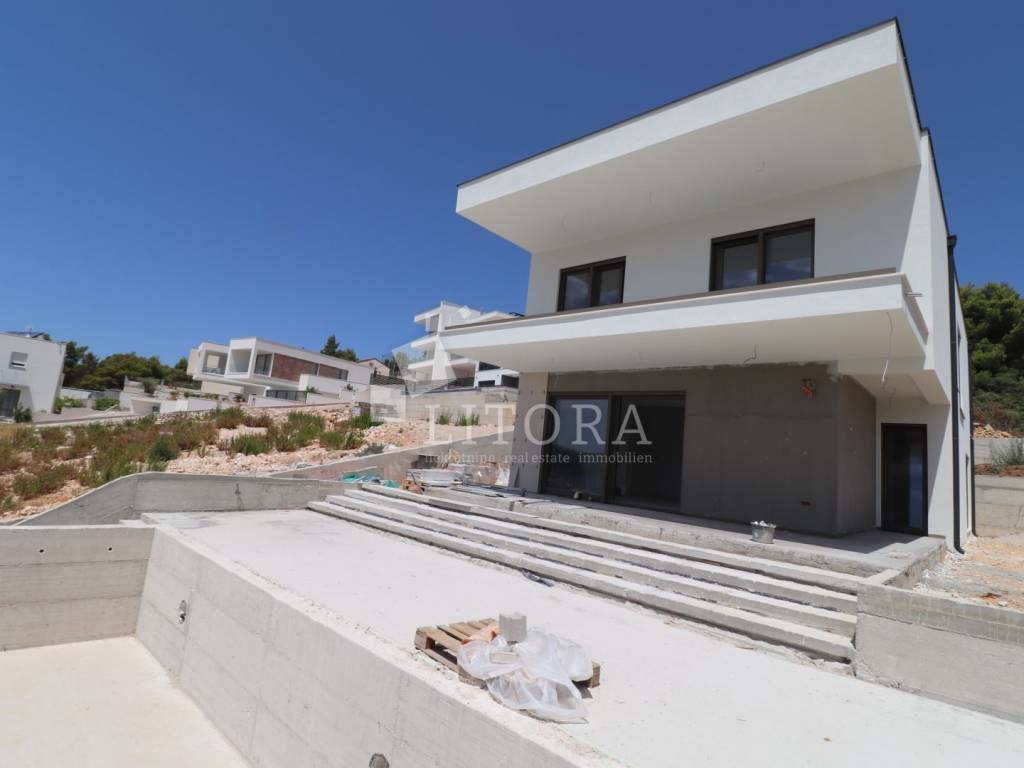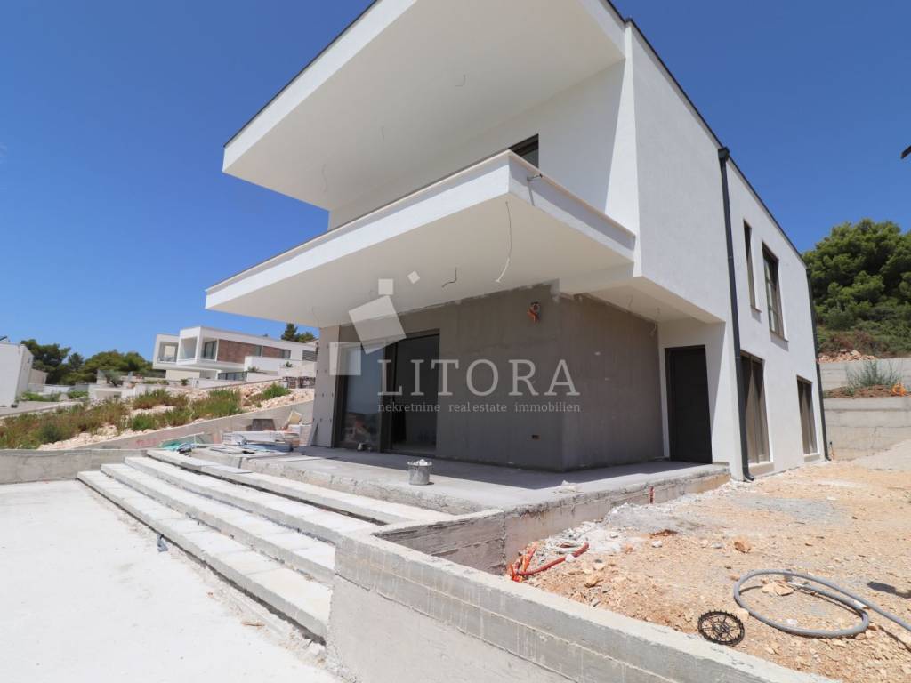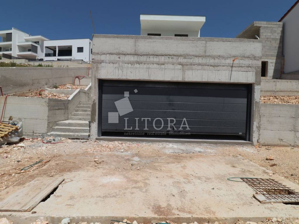 Modern Villa with Panoramic Sea View – Žaborić. Located in an attractive area of Žaborić, just 150 meters from a well-maintained beach, this luxurious villa of modern architectural design perfectly combines top-tier style, functionality, and elegance. With a total usable area of 209.94 m² (of which 177.46 m² refers to the villa itself), the property is set on a 720 m² plot and has been thoughtfully designed to provide maximum comfort, privacy, and enjoyment of the natural beauty of the Mediterranean surroundings. The villa is spread over two floors. The ground floor features an entrance hall leading into a spacious open-plan living room with a kitchen and dining area, a space filled with natural light and warmth. From the living room, there is access to an elegant terrace with a lounge area, sunbathing deck, and a 32 m² swimming pool – perfect for relaxing and entertaining. This level also includes one bedroom, a bathroom, and an additional room that can serve as a home office or guest room, depending on the future owner’s needs. Upstairs, there are three modern and stylish bedrooms, each with its own private bathroom. The bedrooms on the southern side open onto a terrace that offers beautiful sea views. An additional bathroom on this floor further enhances the villa’s practicality and comfort. The exterior of the villa is meticulously landscaped and fully fenced, offering a sense of privacy and security. Due to the terrain’s natural slope, the lower level of the yard includes a garage for two cars and additional parking space for four more vehicles, ensuring ample room for both family and guests. This property is ideal for those seeking a luxurious and modern home for permanent living or vacation, with an emphasis on comfort and proximity to the sea. Situated in a peaceful and well-maintained part of Žaborić, the villa offers everything needed for a high-quality lifestyle on the Adriatic, whether as a primary residence, a summer retreat, or a premium investment in tourist rental.
